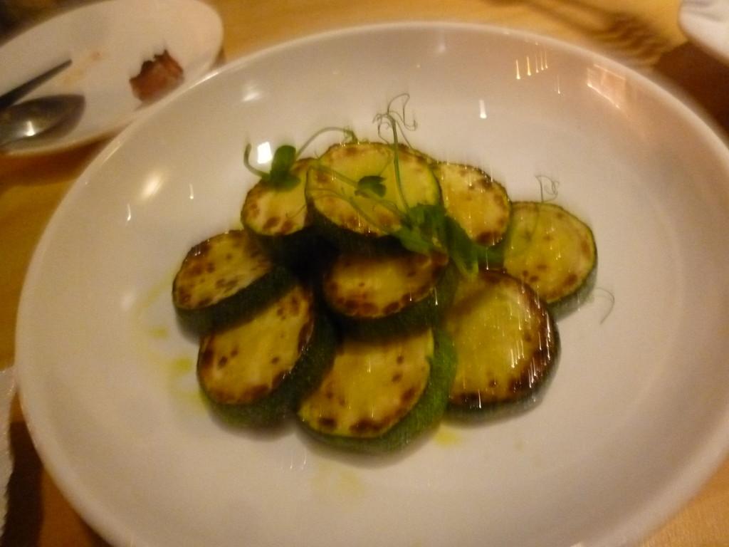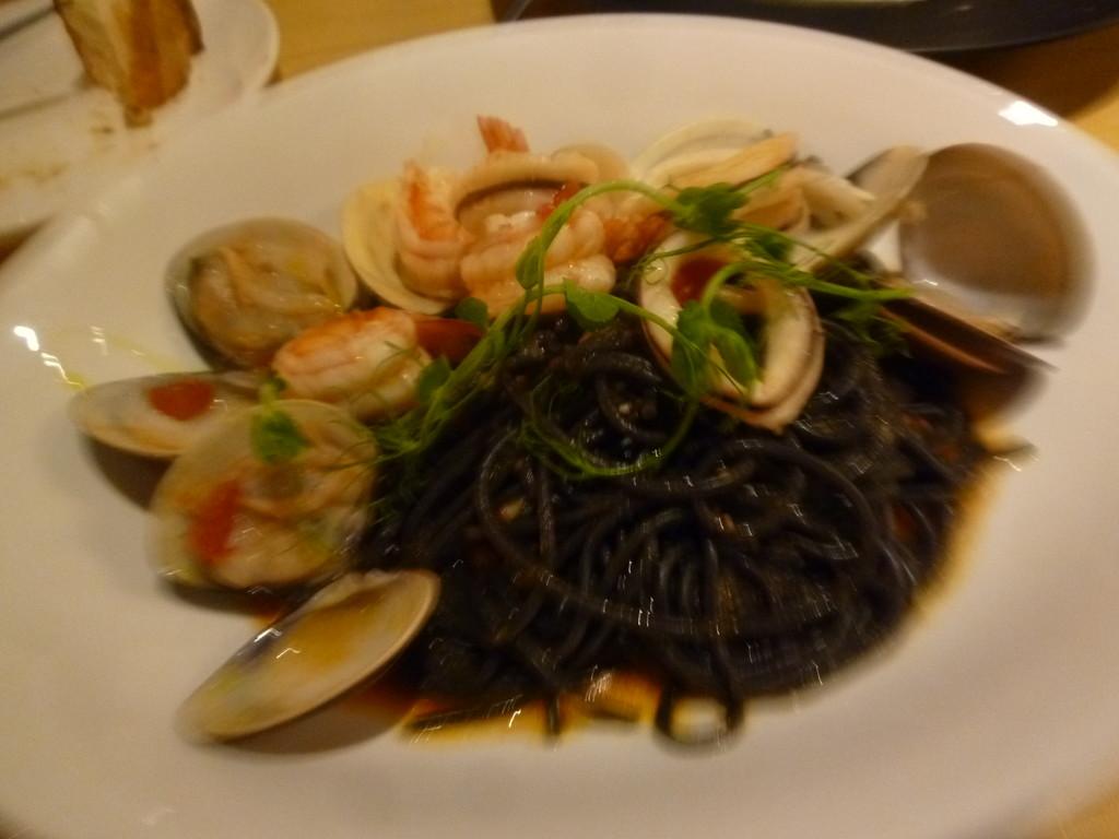 サラダ、卵料理、イカ墨スパゲッティ、牛肉料理、ズッキーニ、