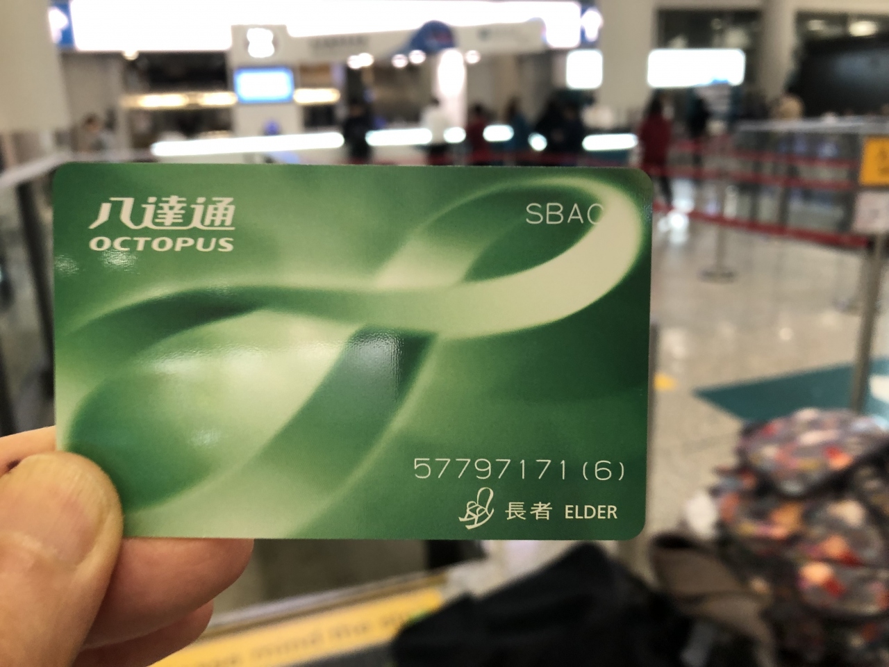 香港空港で入国手続き後の外へでた広いコンコースにエアポートエクスプレスの切符売り場があります。ここでは切符の他にオクトパスカードの購入、チャージができますが、65歳以上はシニアオクトパスカードがあり、パスは普通運賃の半額、子供料金と同じになります。マカオへ行く港珠澳大橋をわたるバスも半額ですからシニアのかたはお忘れなく。
