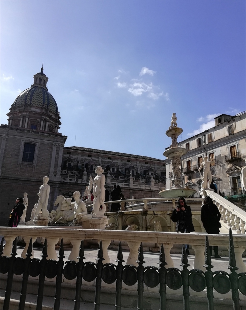 大聖堂から徒歩およそ10分、パレルモの中心部、プレトリア広場の正面にあるルネサンス様式の噴水がプレトリア噴水です。美しい大理石が太陽の光の下でキラキラしています。噴水の縁に座ること禁止と表示しています。