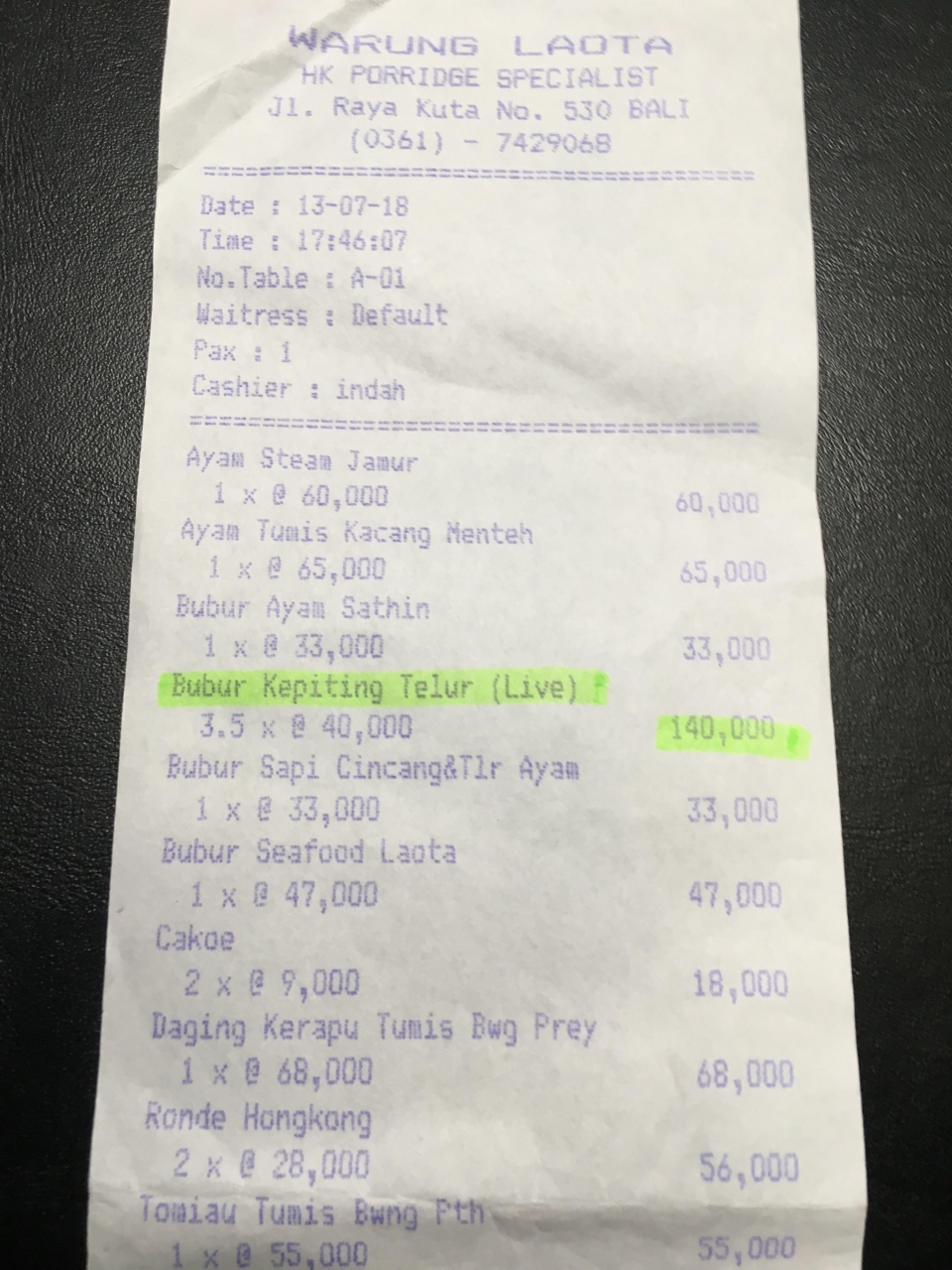 ほとんどのお粥は40,000ルピア程度ですから、0を3つ取って、8を掛けて、320円といったところでしょうか。