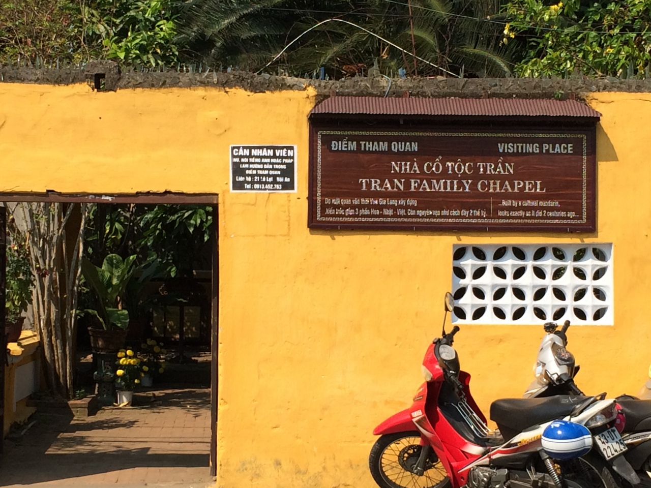 チャンプー通りからレロイ通りを北に歩くと、交差点に黄色の壁の建物がありるのですぐわかりました。扉が開いていたので、中に入ると中庭があり、奥に祠堂がありました。暗く中がよく見えなかったですが、日本の古い家に感じが似てました。今も住居としても利用されており、仏像や古銭の土産物も販売してました。