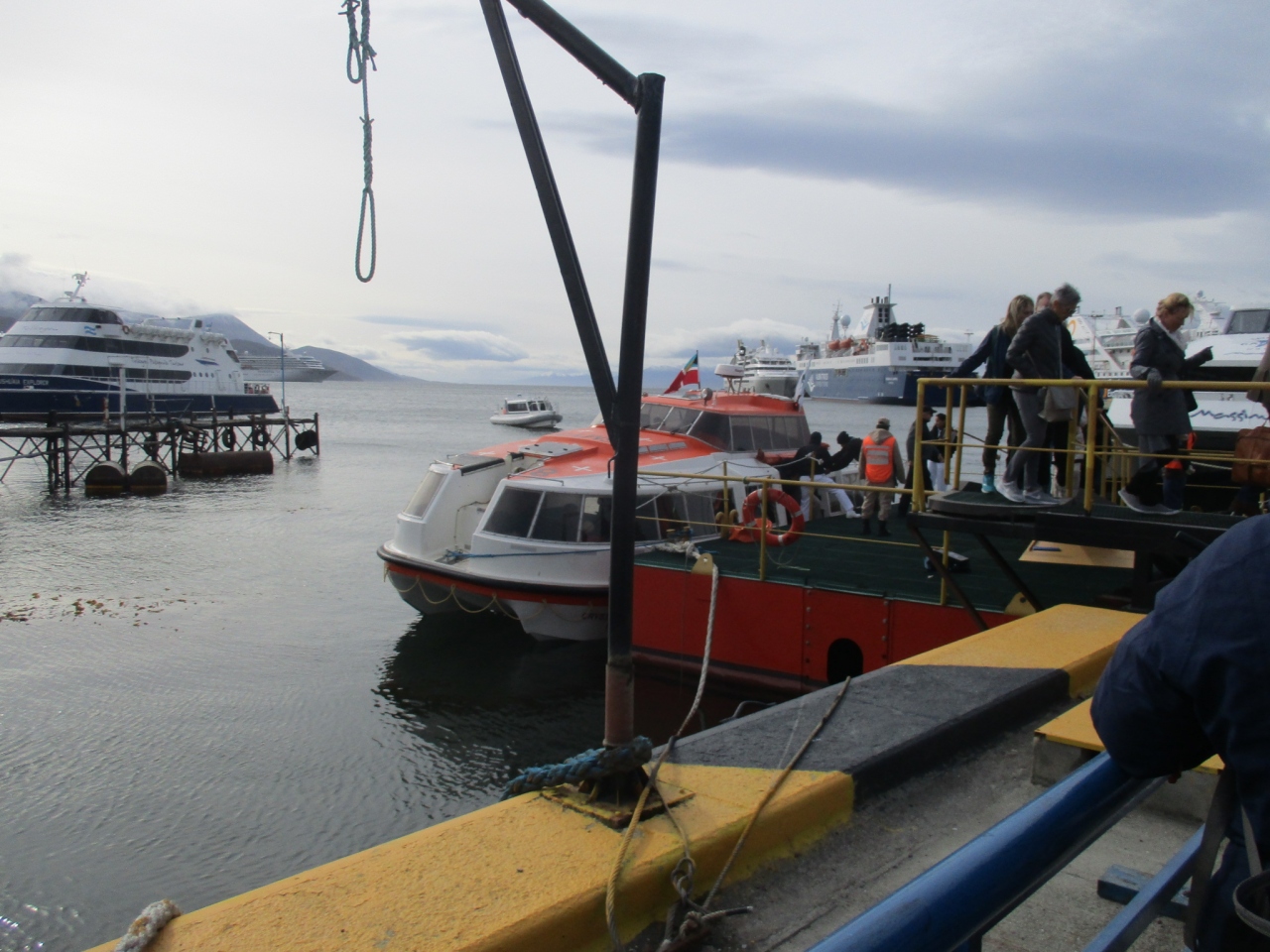 ビーグル水道に面したウシュアイア港は年間を通して強い風が吹くので、訪れた時の船が接岸できずに通船で上陸しました。