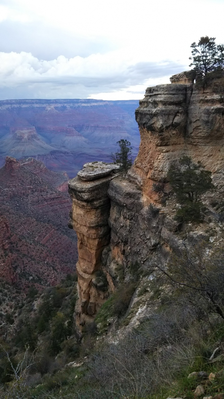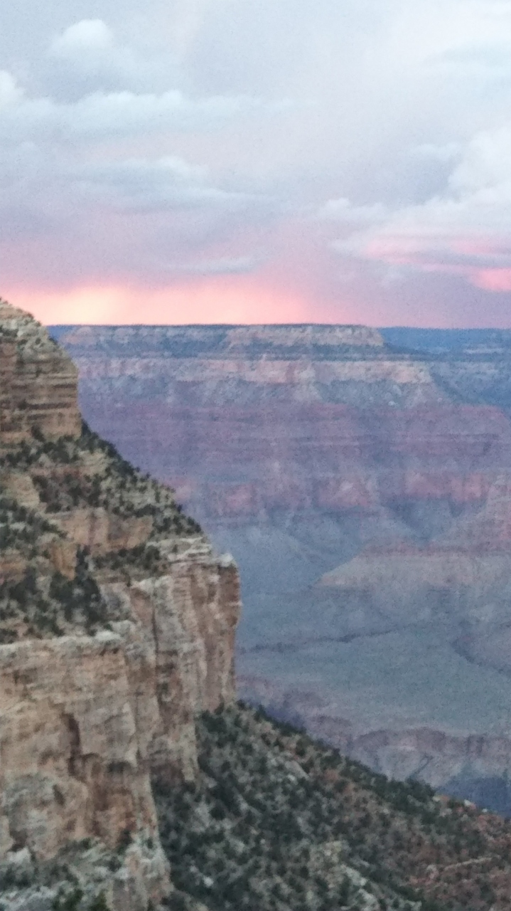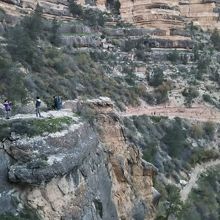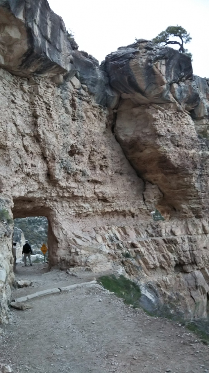 ブライトエンジェル.ロッジから、グランドキャニオンを右手に見ながら歩いて行きました。段々道幅が狭くなりますが、柵もありません。生憎、雲が掛かってサンセットは見えませんでしたが、代わりに、稲妻が雲から渓谷に落ちるのを何回も見ました。