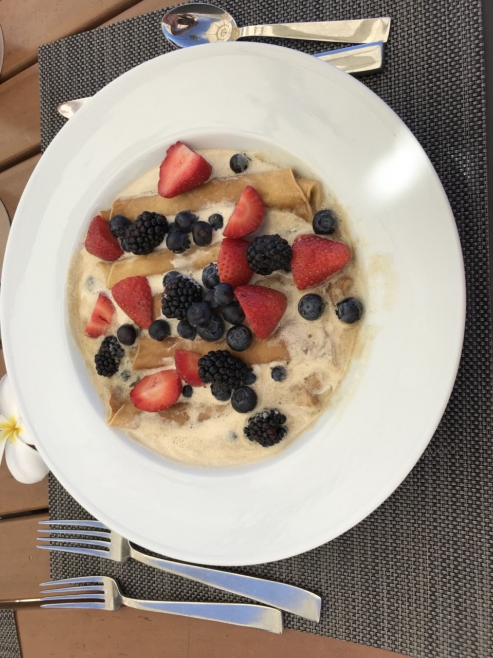 朝食メニューにある、薄焼きパンケーキを食べに行きました。11時前に予約したからか誰もいなかったです。席も選べたので店外にしました。パラソルが大きいので日差しは気にならなかったですし、景色もすっごい良かったです。パンケーキは今まで食べたことない感じでした。ただかなり甘いので飽きるかも。