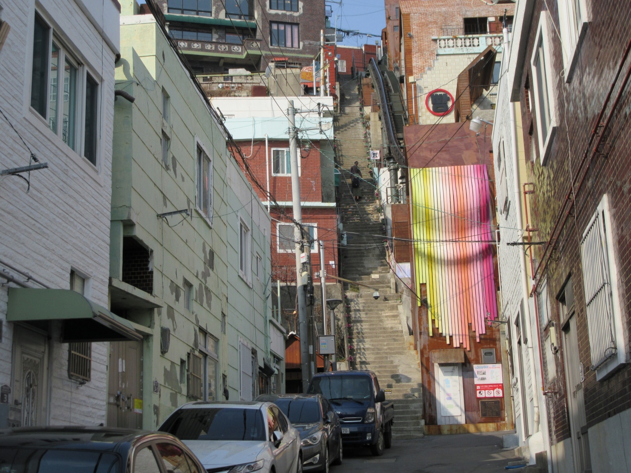 このあたりは朝鮮戦争の際、北朝鮮から逃げてきた避難民が住居を求めて集落を作り、家屋を建てたところです。釜山駅から大きな道路を渡って山に向かって歩いて行くとたどり着けますが、途中には急な階段や坂道があって、かなり体力を使います。