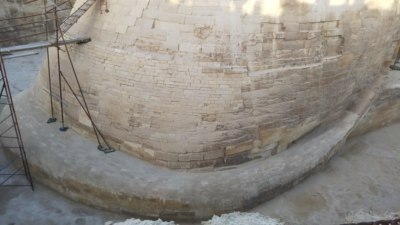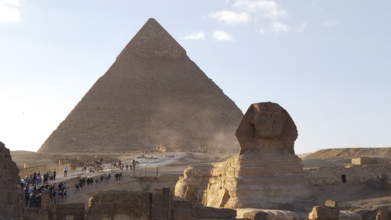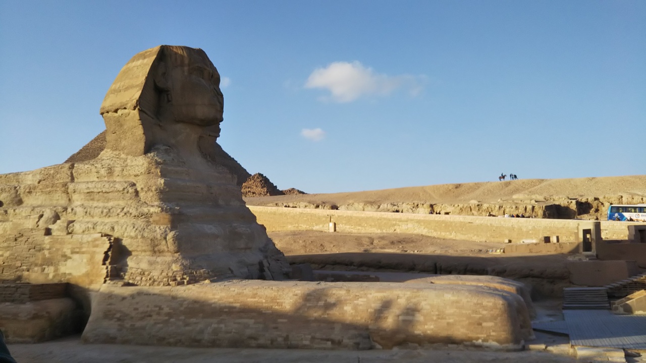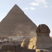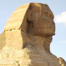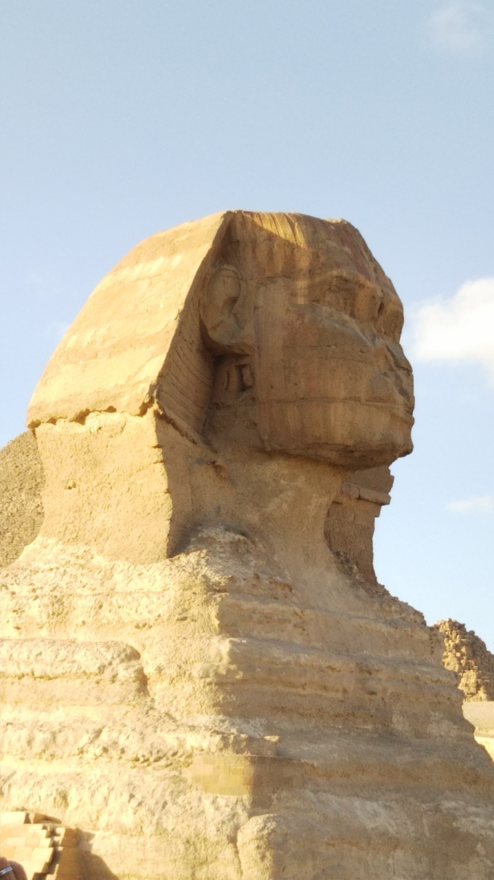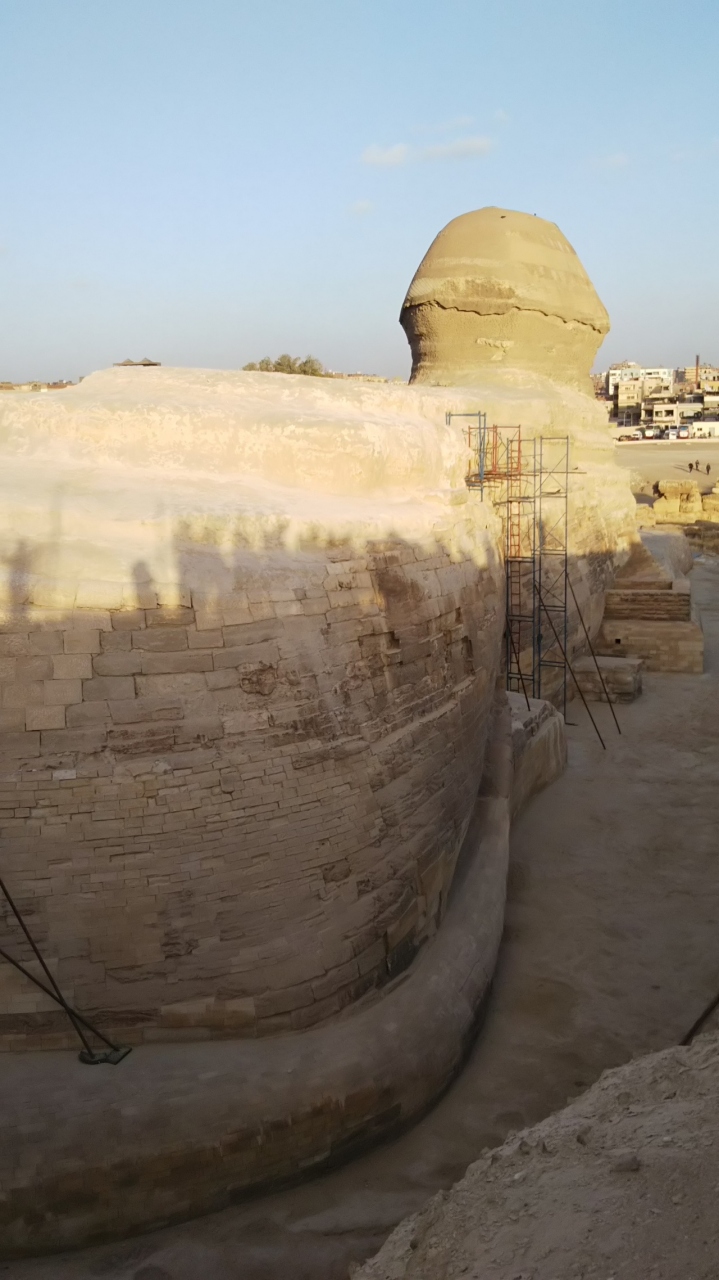 正面からの写真はお馴染みですが、近くに行くと前足や胴体はとても長く、後ろに回ると尾も長く、体に巻き付いています。鼻はナポレオンが打った大砲で欠け、顎ひげは大英博物館にあるそうです。エジプトに来たなあと実感出来ました。