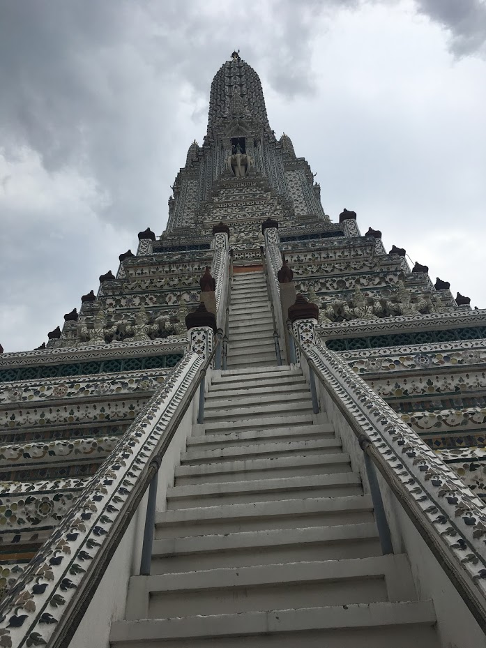 チャオプラヤー川をボートに乗って訪れました。大仏塔の中間地点までは上ることができるのですが、階段が急なので、年配の方がのぼるには注意が必要です。塔には陶器が埋め込まれており、きらきら光ってきれいでした。