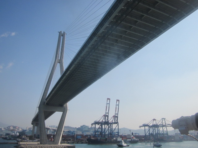 港町釜山を代表する橋の一つですが、ここは日本人の方にとっては、国際航路の利用過程で眺めるのに良い橋だと思います。国際フェリーターミナルの立地上、関釜フェリー・ビートル・カメリアライン・パンスタードリーム等、何れの船に乗ってもこの橋を直下から眺められるので、甲板に立ち寄って、ファンネル越しの釜山港大橋、といった船旅ならではのアングルでの撮影が特にお勧めです。