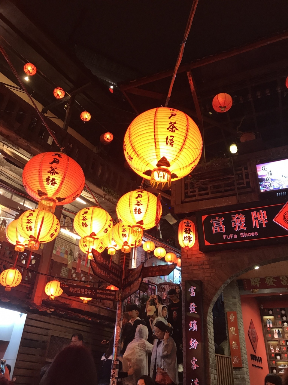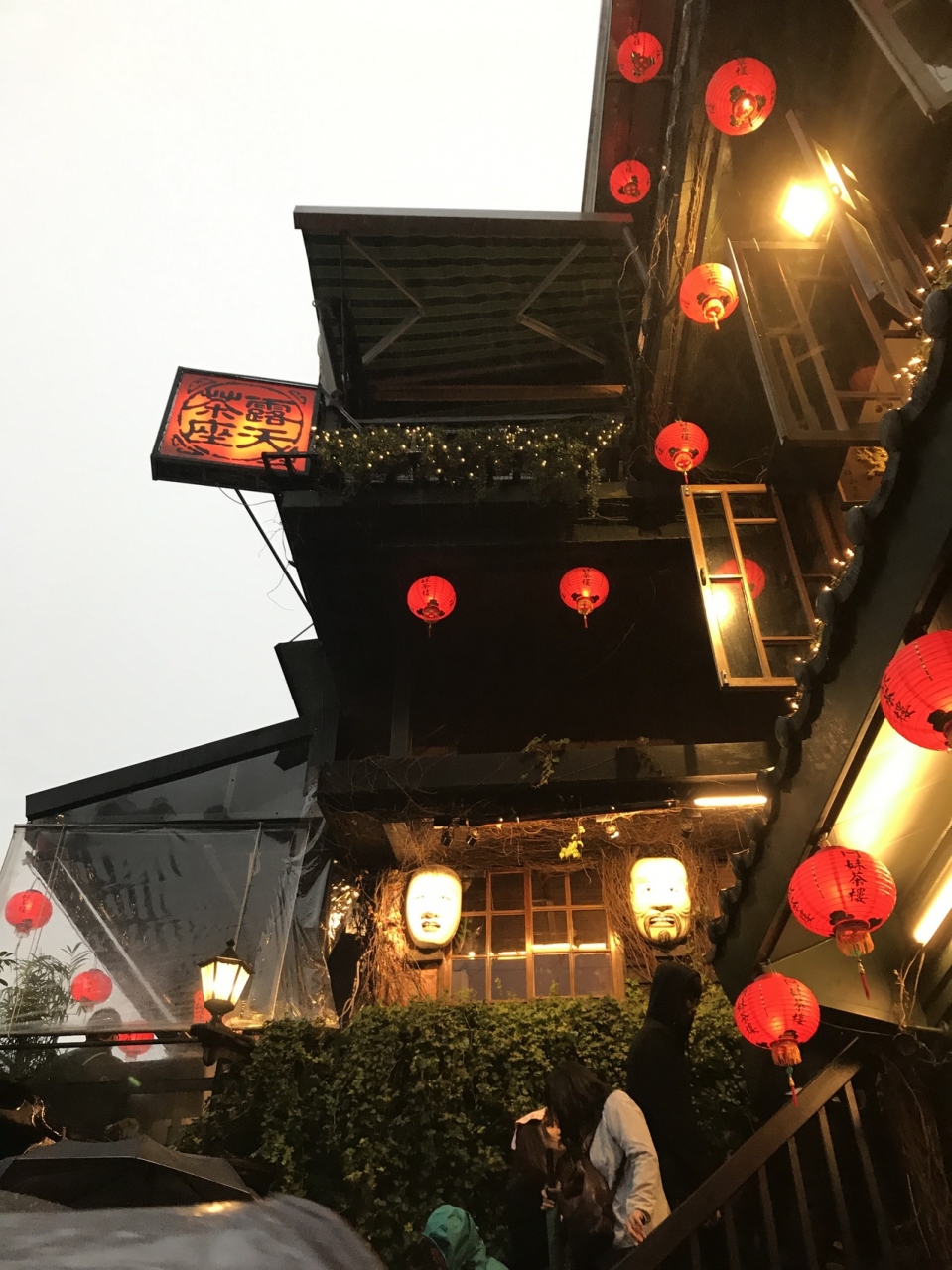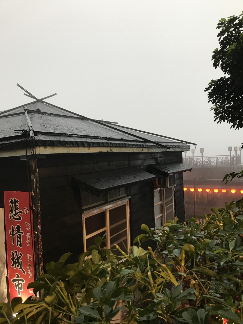 九份は急な階段と狭い道にたくさんの人があふれていました。しかも一年のうち、雨の日が殆どとの事です。人混みで満員電車状態だった為、傘はさすことができませんでした。
