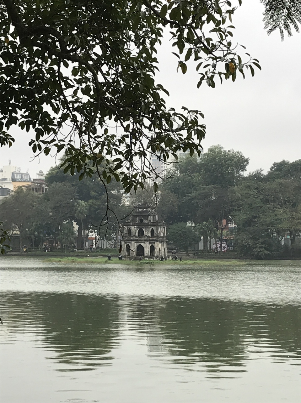 ホアンキエム湖の中にある『亀の塔』、可愛い雰囲気ですが残念ながら行くことは出来ません。