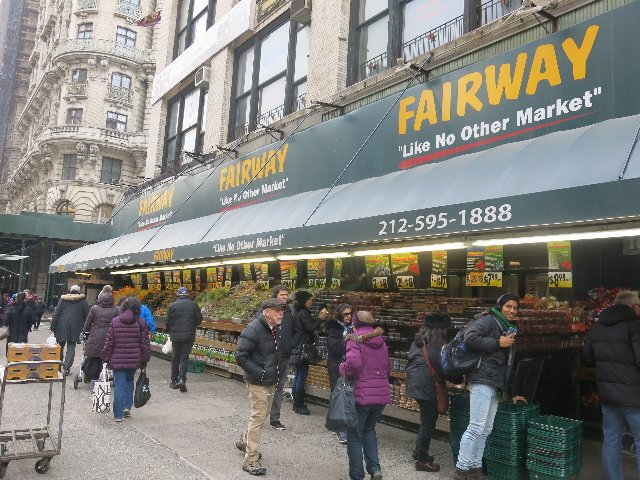 ブロードウェイ沿いにあるスーパーマーケットで、店先に野菜や果物などが大量に陳列されています。