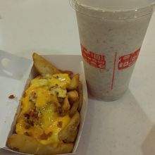 小腹がすいたので、チェダーチーズとベーコンビッズののったポテトと、オレオシェークをいただきました。両方で10ドルほど。シェークは生クリームがたっぷり乗っています。