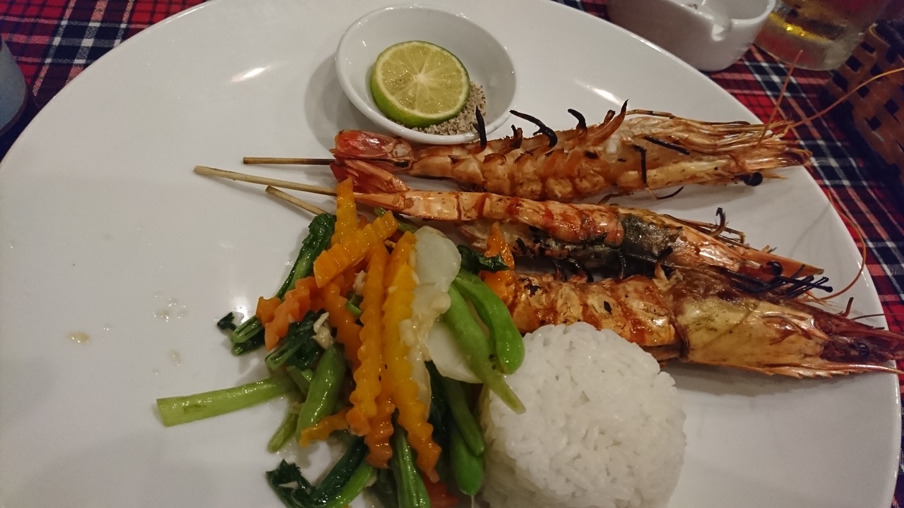 ホテルから歩いて散策していると、外国人でかなり賑わっていたので入ってみた。お店の前で海老を選び塩焼きにしてもらい、サイコロステーキといかを頼みました。海老の塩焼きが美味しくて、おかわりしたいくらいでした。サイコロステーキといかはご飯がついてくるので、これでお腹一杯になりました。全て美味しかったです。