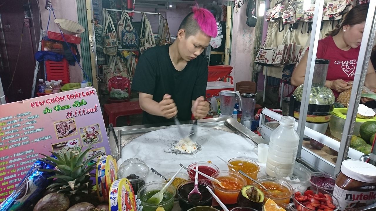夜8時頃行くと、たくさん人がいて賑やかでした。シーフードのお店、スムージー、ジュース、ロールアイス、ピーナッツ、洋服、真珠、小さい商店等がありました。シーフードのお店に入り、海老と野菜炒めとチャーハンを頼みましたが、全部美味しかったです。野良犬がテーブルの下にずっといるのが嫌でした。