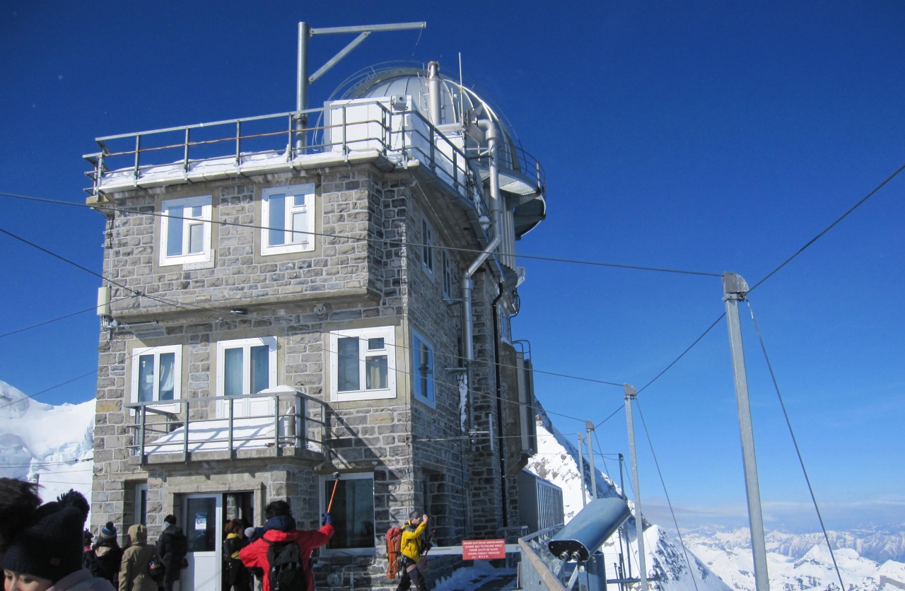 登山鉄道の終点、かなり大きいです。よく晴れていて、外から周りの山々がきれいに見えましたが、やはり寒いので、中へ。室内もレストランやチョコレートミニ博物館、氷のトンネル、彫刻、光の展示、人形、いろいろあります。窓から見える氷河は圧巻です。