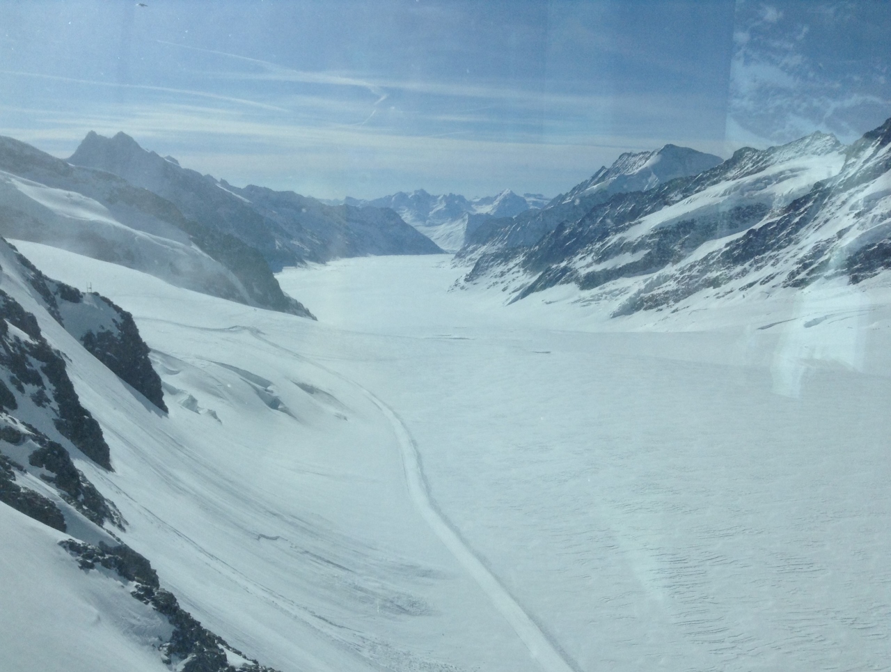 氷河の下から掘られた氷の宮殿が素晴らしい。酉年のため、鶏の氷の彫刻もありました。中国人の団体客が何組も。窓から見える世界自然遺産のアレチ氷河がアルプス山脈の中に最長の氷河だそうで、全長24キロメートルあり、圧巻です。