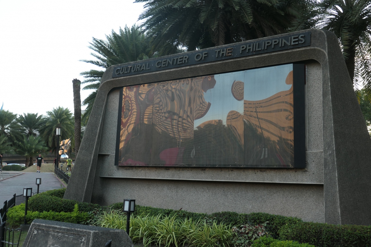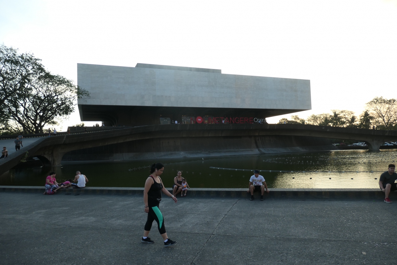 マニラ都立博物館を訪問した際に、前方に大きくて立派そうな建物があったので行ってみました。建物の周囲は公園として整備され、入口部分にフィリピン文化センター(Cultural Center of the Philippines)の絵画付きの石碑がありました。文化センター前は車の通行量の多い主要道路ですが、信号や横断歩道もありませんでした。車に注意しながら道路を渡ると、広大な広場、大きな池、そして池の上部に文化センターの建物がありました。ここを訪れたのは夕方の5時頃でしたが、丁度、建物から衛兵が出てきて掲揚されていたフィリピン国旗を降ろして収用していきました。文化センターがフィリピンの国有施設であることが分かりました。