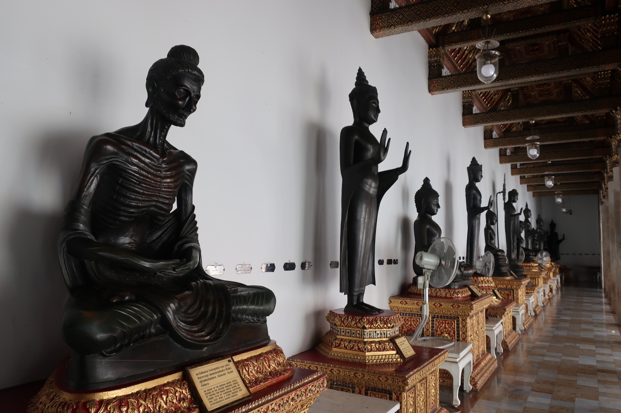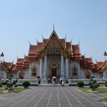 「大理石寺院」という名前のとおり、大理石がふんだんに使われているお寺です。ご本尊の台座にはタイで特に敬愛されているラーマ5世の遺骨が納められているそうです。本堂の裏手にまわると、鈴の音が響く回廊があります。回廊にはタイ国内の各地、ミャンマーや日本などから集められた仏像や、いろいろなところの仏像を模して作られた像が並んでいて、仏像のお顔を見比べながら歩くのが楽しかったです。中国やインドから来たと思われる団体でにぎわっていました。