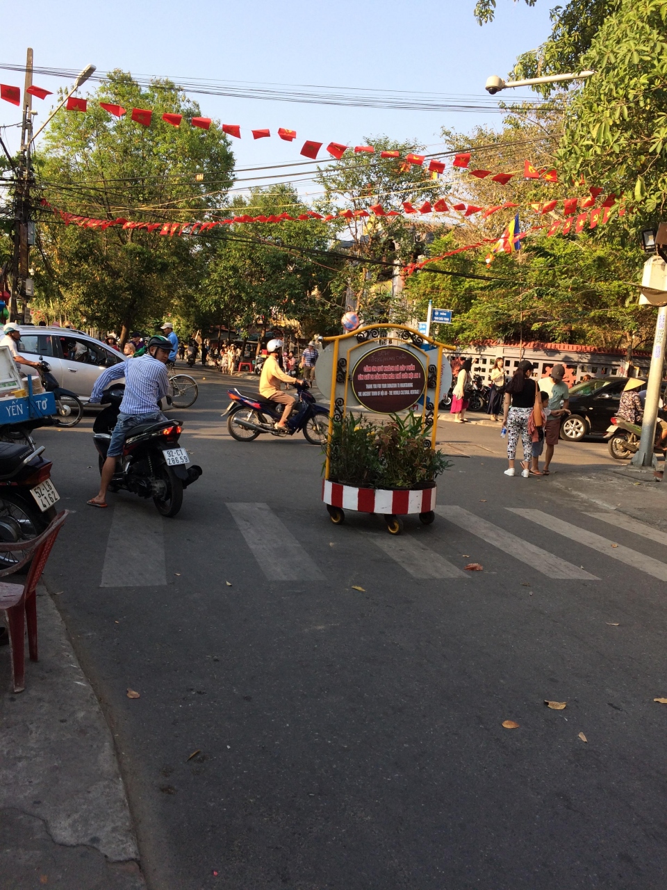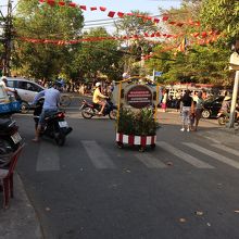 日本橋の西側、チャンフー通りに向かうとすぐに、トゥボン川に向かう南北の通りがあります。北へ向かって進むと、徳賽寺があり、さらに進むとホワイトローズ店があります。旧市街から離れていくので、ローカル色のある飲食店、日用品店、露店がありました。田園風景も見られ、サイクリングには適していますが、交通量が多いので注意して下さい。