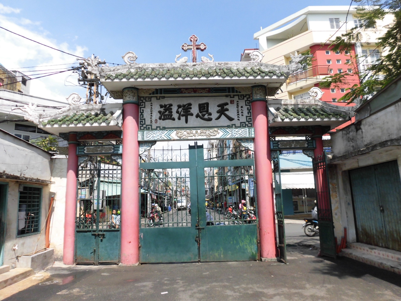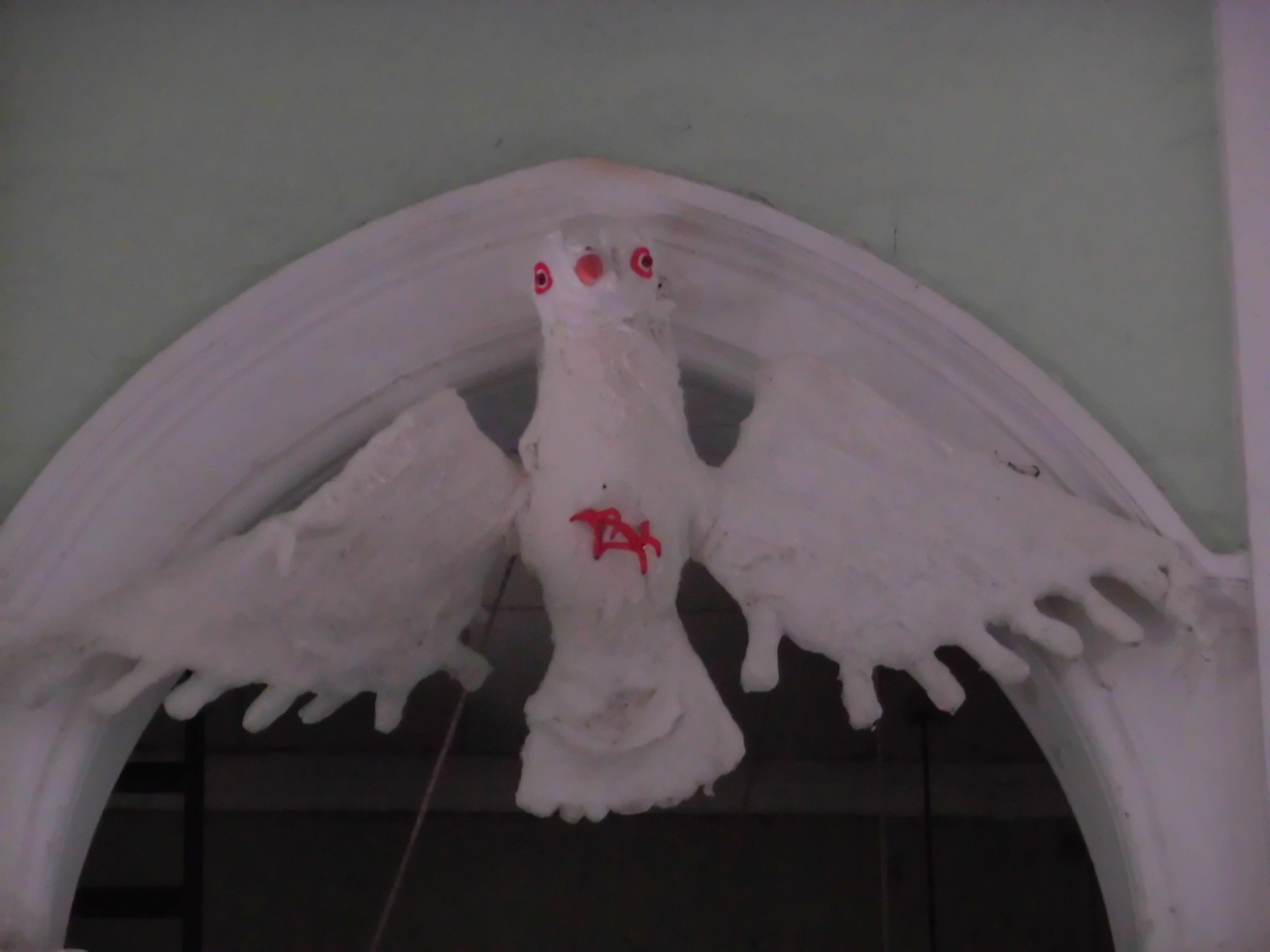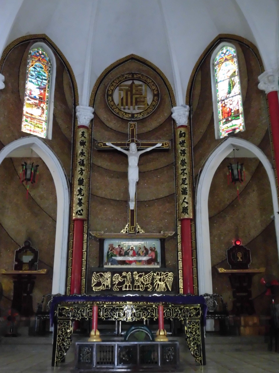 数年前に行ったときは教会の内部の見学ができませんでした。今回も行ったときは扉が閉まっていましたが、外観の撮影途中にミサの準備のために扉が開き、3回目にして初めて内部の見学ができました。正面の十字架のイエス様とその下にある最後の晩餐の絵画をしっかり見てきました。一番びっくりしたのは、入り口の上にある大きな鳩?の飾り物でしたが…。