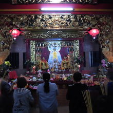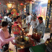 16体の神様が祀られており、信者の方は線香を持って順にお参りされていました。多くの神様が祀られているので、その分見どころもたくさんありますが、それ以上に信者の方々のお参りしている様子を見学するのも興味深かったですね。