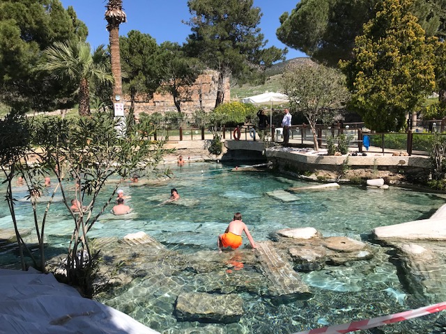 世界遺産のパムッカレの石灰棚を登りきったところにヒエラポリスがあり、その中にあります。ANTIQUE POOLという表示です。見るだけなら無料ですが、温泉に入るには50トルコリラ取られました。遺跡に温泉が湧いているので、足元は倒れた柱などがあり、通胃が必要です。お湯はぬるいし、汚かったです。日本人からすると温泉という感じではありません。見るだけでもよかったかな、と思いました。