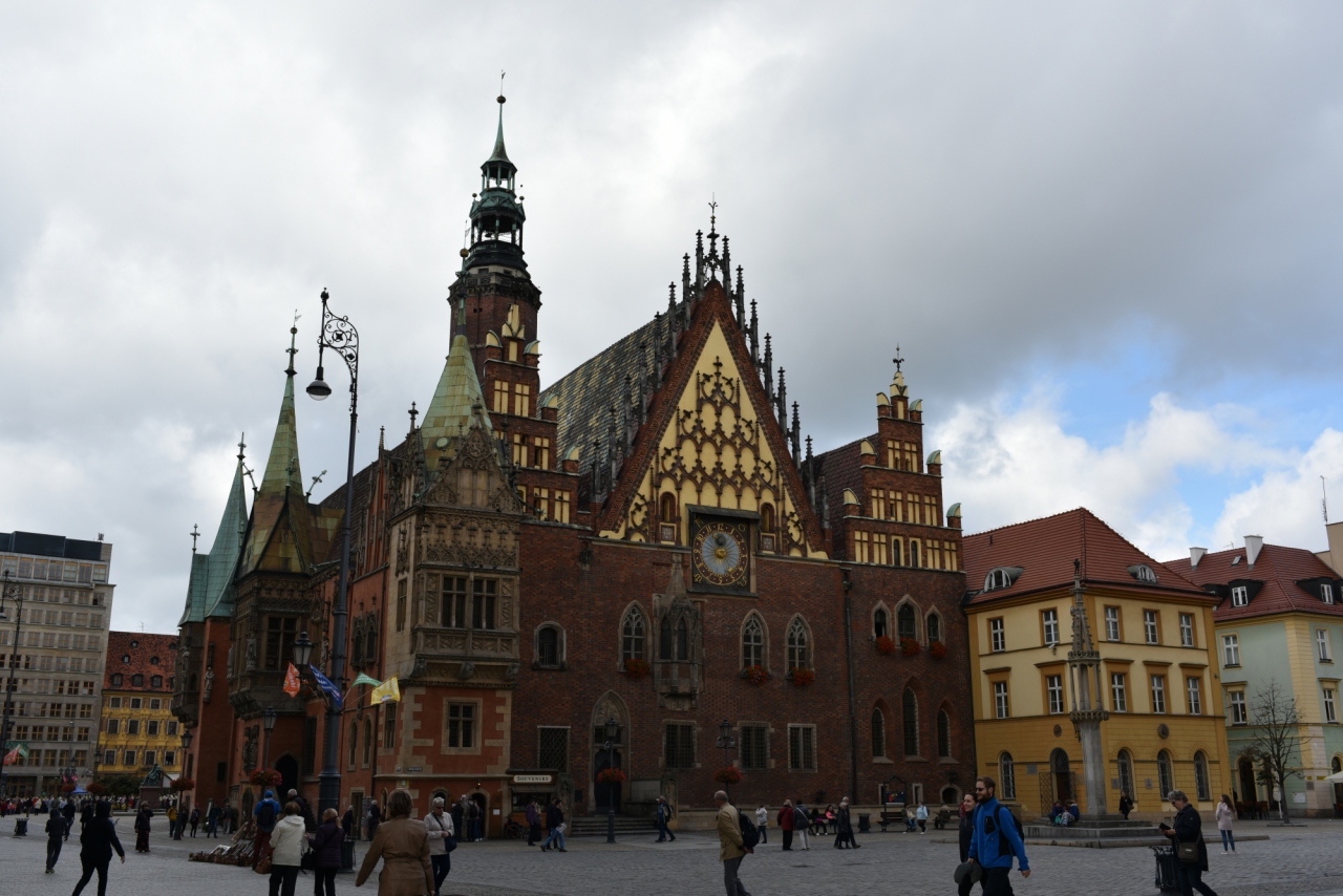 ヴロツワフの中心である旧市街広場に建つ市庁舎。数百年にわたり増築を重ねてきたため非常に複雑な外観をしているが、見ていてまったく破綻していないデザインがすばらしい。