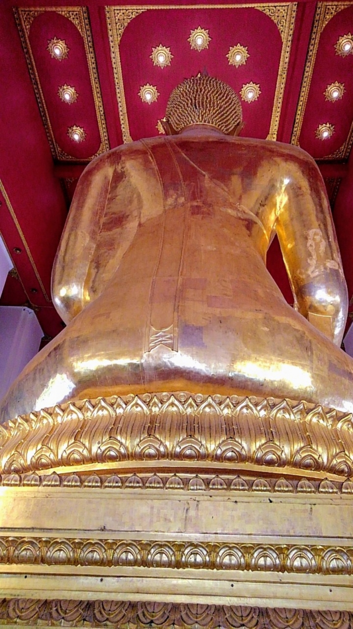 建物の屋根の部分が非常に特徴的でそこにタイの寺院らしさを感じることができました。こちらの建物内には高さ約17メートルの黄金に輝く巨大仏像がありました。眩しいくらいに輝く仏像は、その仏像そのものがパワースポットのような感じでした。1951年の巨大仏像の修復時には体内から何百もの小さな仏像が発見されたそうです。間近で仏像のまわりをぐるりと一周することもできました。