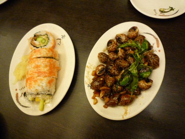太巻き寿司、巻貝、精進料理、刺身、鮎などの魚、烏賊、貝料理、