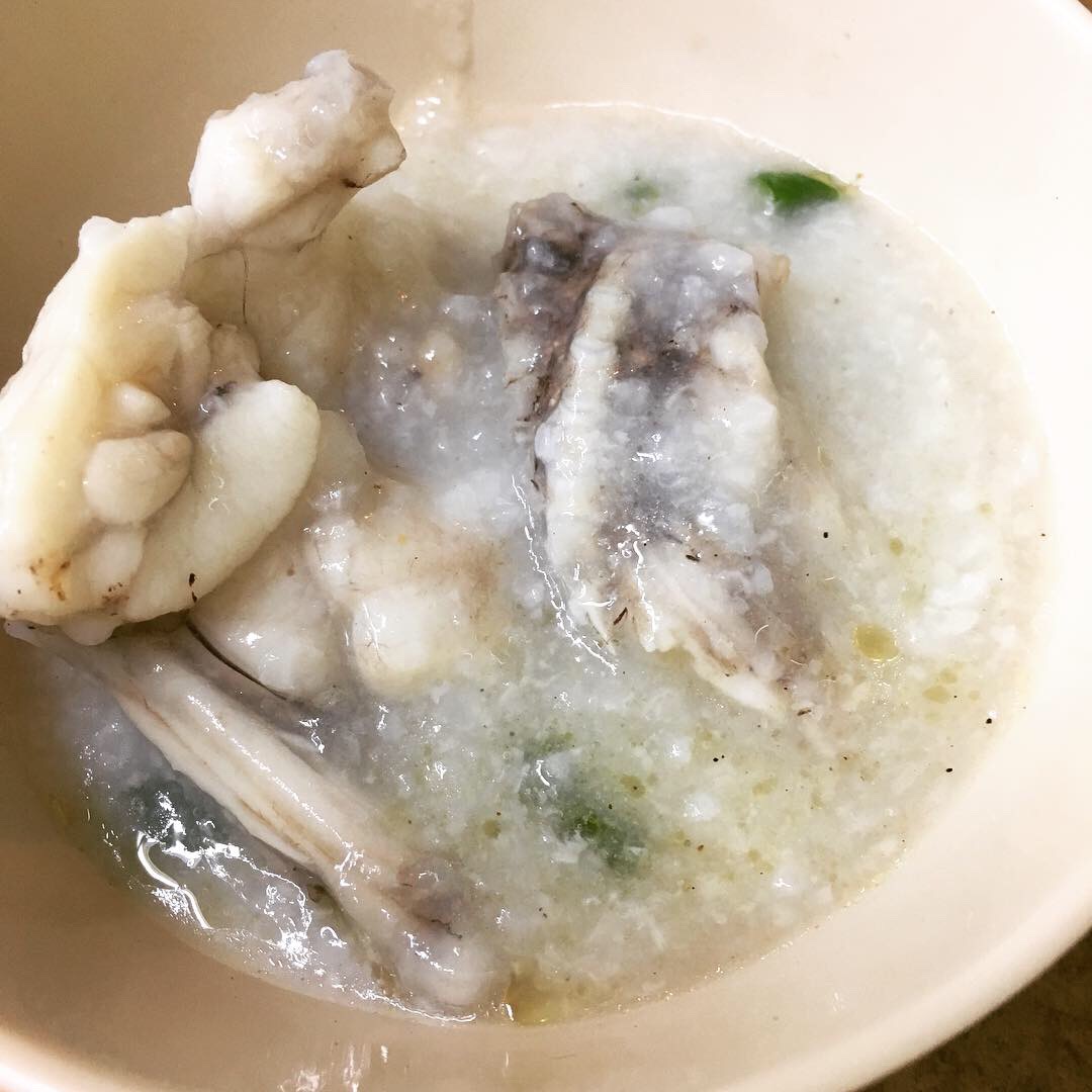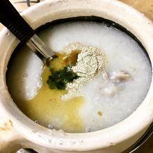 土鍋に白いお粥に、骨付きのカエルの肉が入っている。