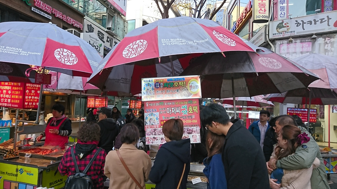 BIFF広場にはおでんや揚げ物などいろいろな屋台がでていますが、いちばん人気なのはシアホットクで、いつも行列ができています。