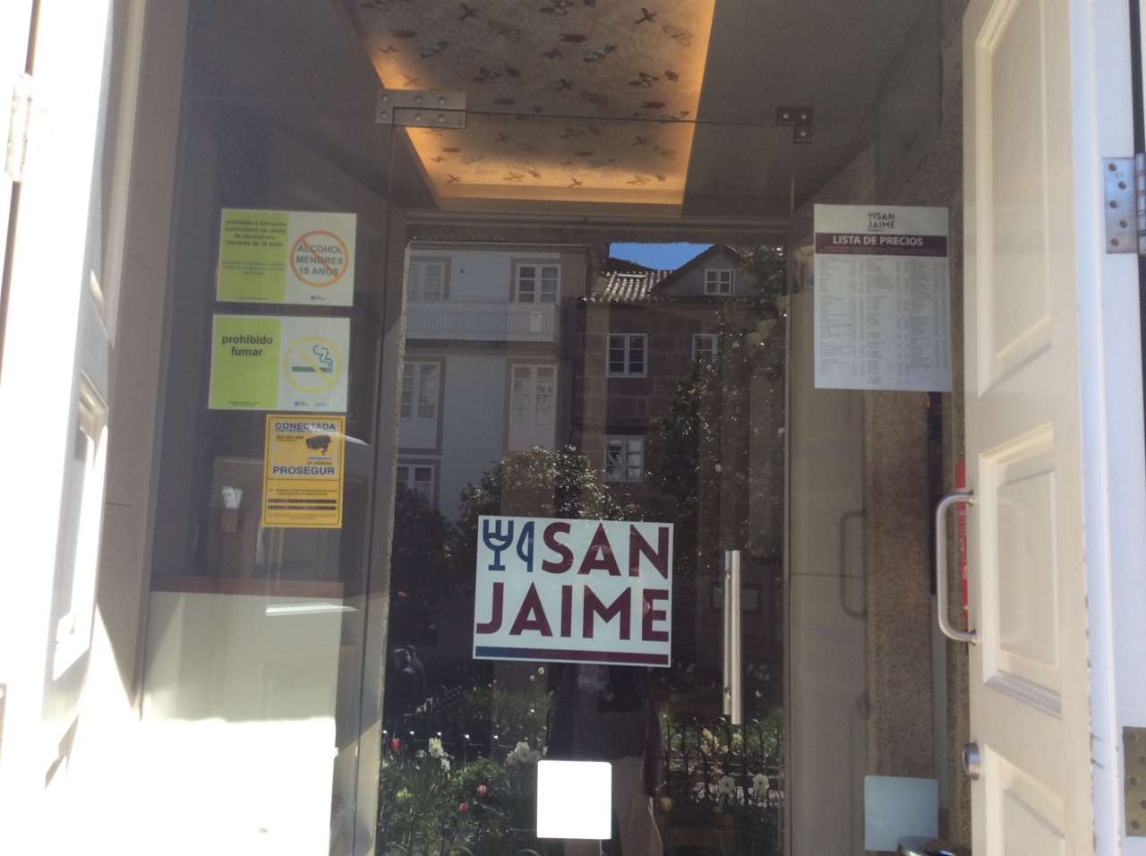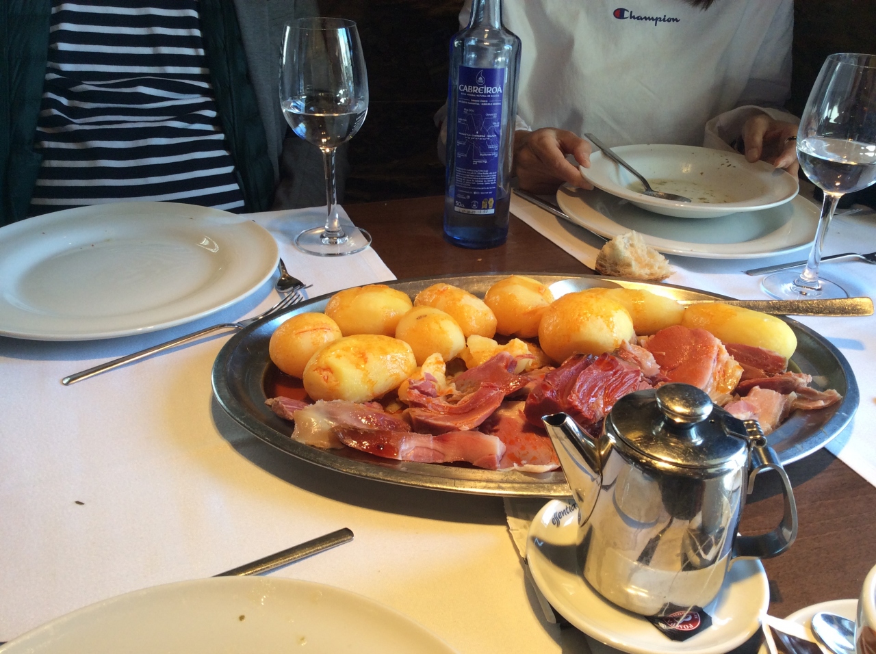 スペインは初めてだったので、スペインで初めての昼食。サンチアゴデコンポステーラの町中で、前は花が咲き、人々がくつろぐ感じの広場に面している。味は、うーんハムがメインだというガリシア料理だったが、ちょっと合わない感じでした。