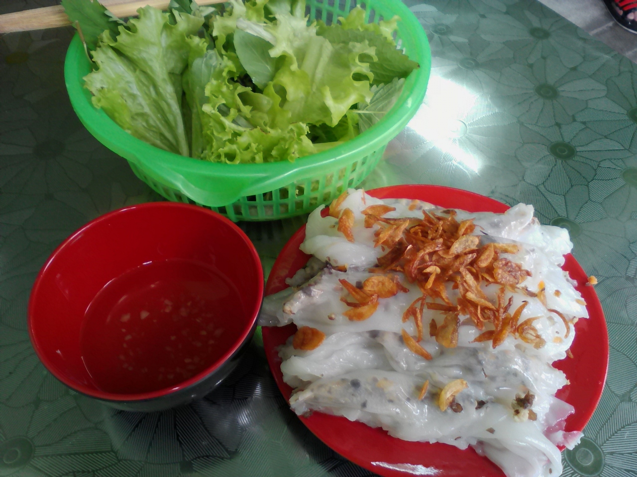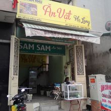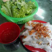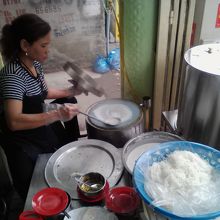 看板の“An Vat”が目立っていますがファストフードとか軽食と言う意味で店名は「Sam Sam」になります。表の看板に一番大きく書かれていた「Banh Cuon Nong」を食べてみました。Nongは熱いと言う意味で“作りたて”ということです。そのとおり私が注文してから作り始めます。米粉汁を鍋に張った布の上にたらし、おたまで薄く延ばし蒸していきます。そして箸でくるくるっと巻取ってお皿に。さすがプロの技。この様子を見るだけでも楽しめます。お味は…まぁふつーです。これで15000ドン。お値段からしておやつですね。他にはChao Lon(モツ入りお粥、3万ドン)、Bun(3万ドン)などがあります。