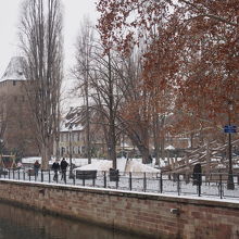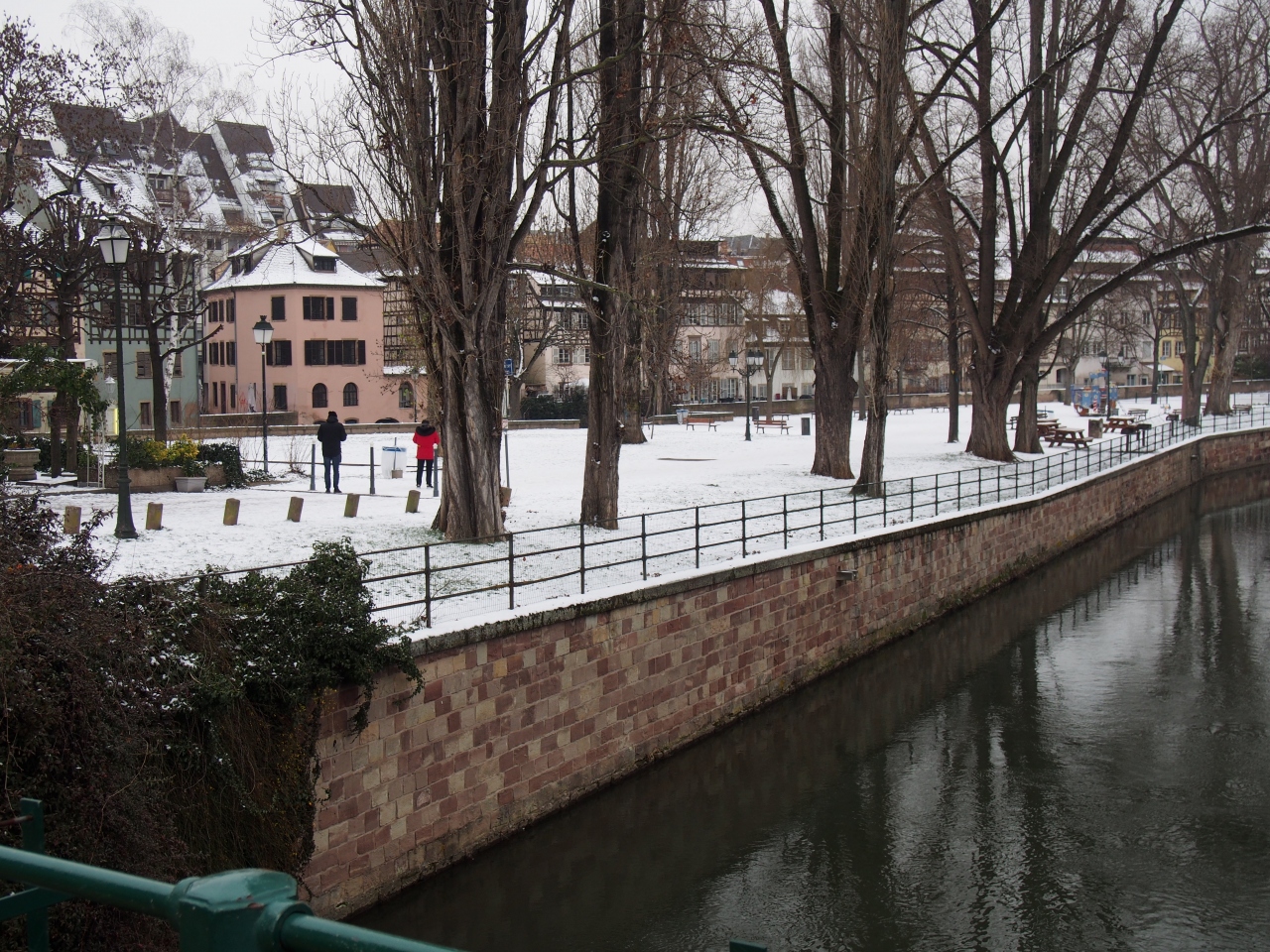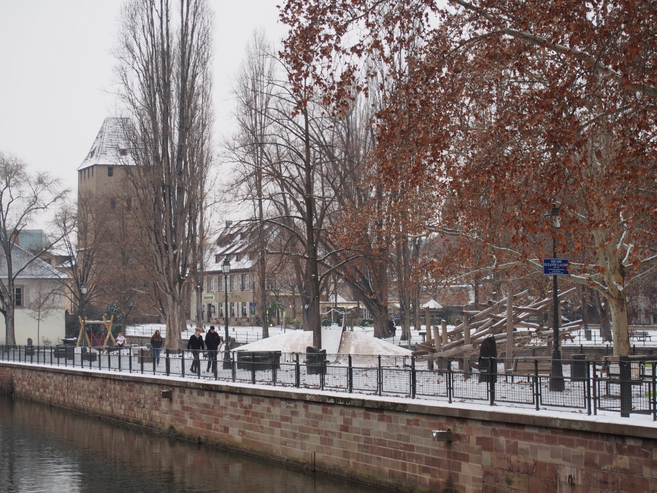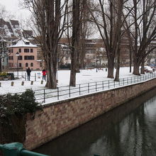 木骨組みの家が建ち並ぶプチフランスからクヴェール橋やヴォーバンダムへと歩いて行く途中にある公園です。イル川の中州にある公園で、細長い公園です。公園は数日前に降った雪で、公園が一面に白い雪景色でした。寒い冬の日であったので、歩いている人もほとんど見かけませんでした。ただ白一面の景色はとても美しかったです。