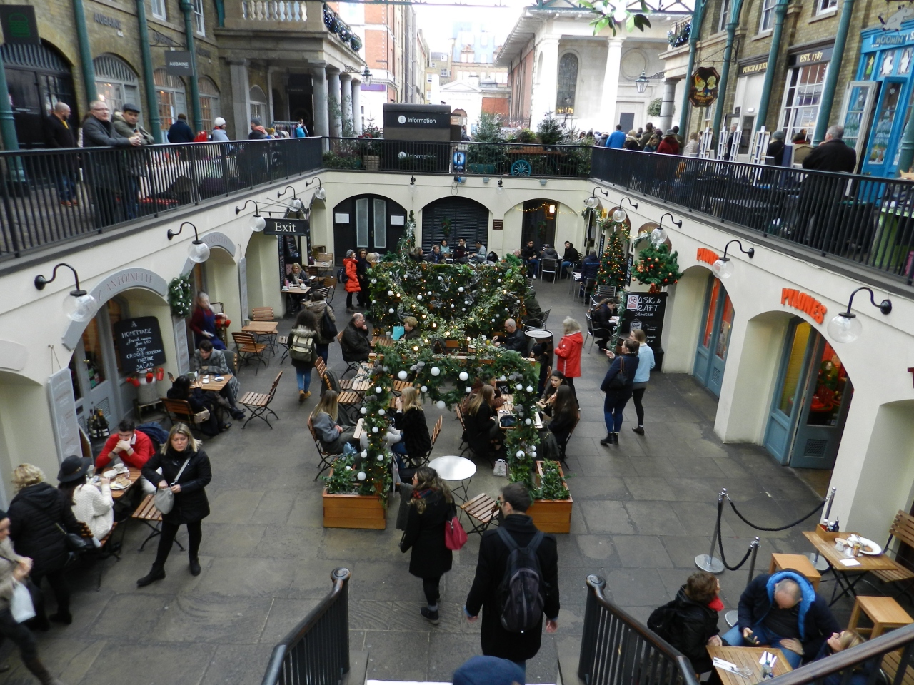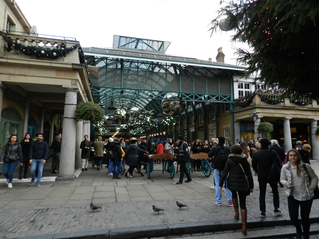 大英博物館見学の後南へ歩いて行きました。大きな商業施設区域で大道芸人が多くショッピング、レストラン等に行く多くの人々で賑わっています。17世紀までは壁に囲まれた広大なコヴェント(修道院)所有の土地があったことが名の由来で現在の建物は1830年代に建てられた物でレストランやカフェ、ショップ等が建ち並ぶ人気のショッピングセンターになっています。前には聖ポール教会が建っています。