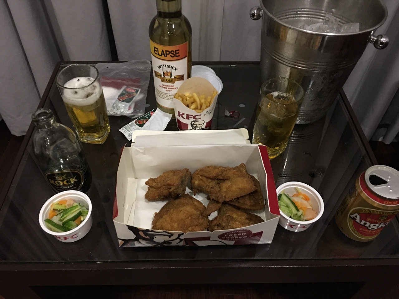 私たちは2週間以上ケンタッキーFCを食べなければ体調不良になりますので、シェムリアップで見つけた時にはすぐにテイクアウトさせてもらいました。