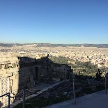 ブーレの門の遥か向こうの丘がフィロパポスの丘で、