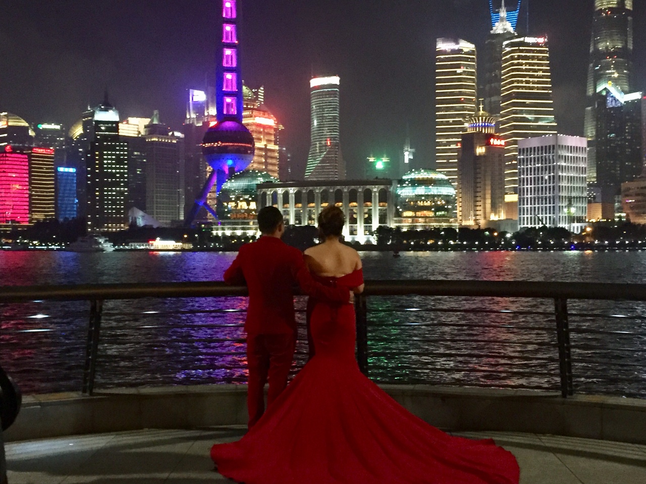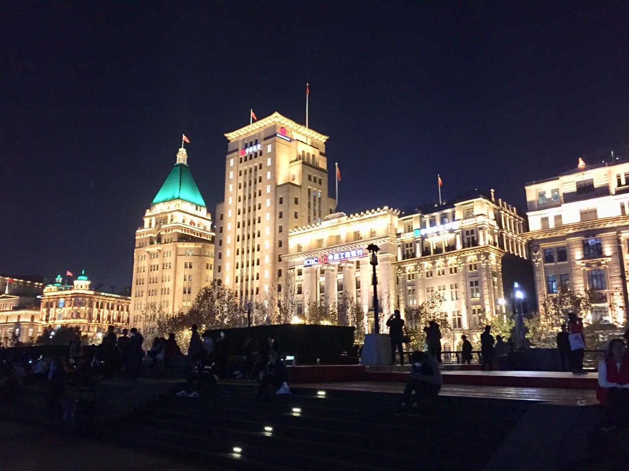 対岸に見える浦東の近代的な高層ビルのネオンとバンドの歴史を感じる輝きとの