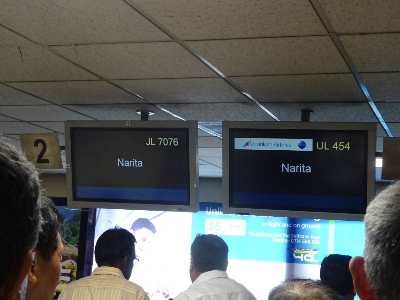 成田を発ち、現地時間の18時頃に到着。3店舗並んだ両替所はどこもレートは一緒だと主張していました(確認していないので、真相は分からず)。私たちは真ん中の店を利用。帰国時に日本円に戻す際は控えが必ず必要なのでなくさないようにご注意下さい(スリランカのお金は国外へ持ち出しできません)。