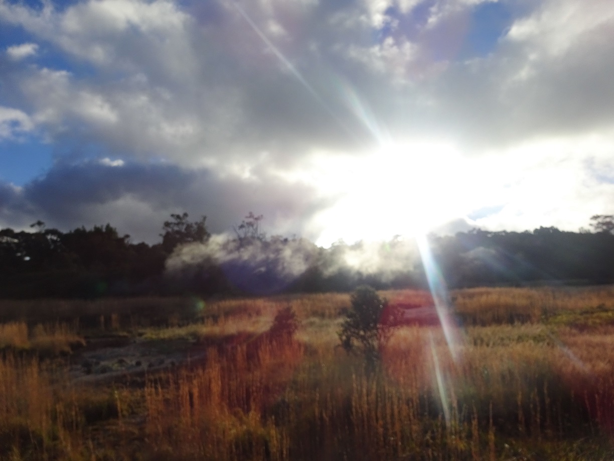 駐車場からしばらく歩き、展望台から、噴火の鎮まったハレマウマウ火口を見ました。