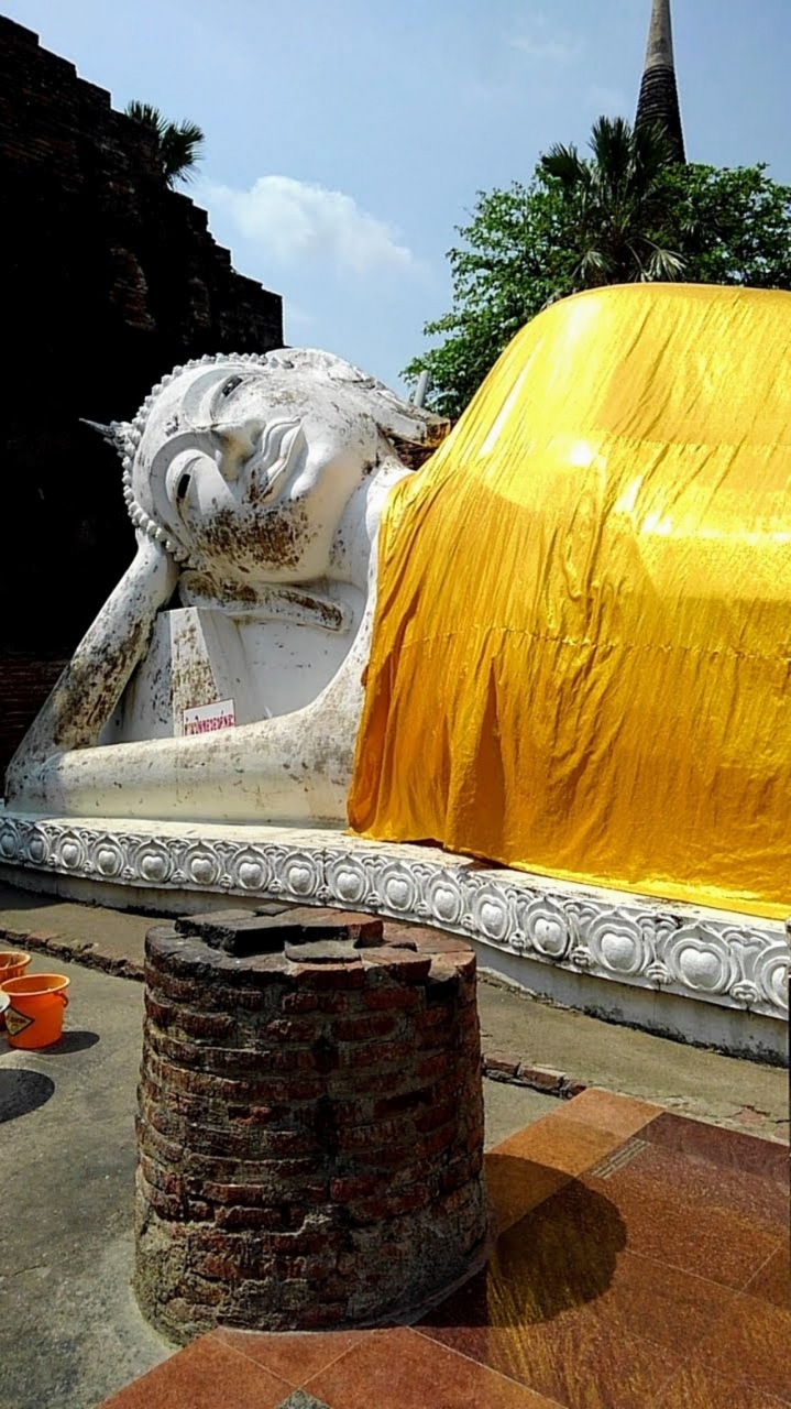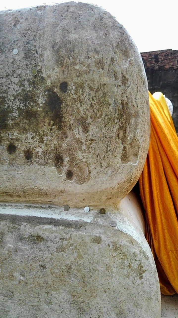 ワット・ヤイ・チャイ・モンコンにある白い涅槃仏は、その涅槃仏様そのものがパワースポットのようでした。涅槃仏様の足裏部分にコインを貼り付け、と、言っても糊やテープで貼るのではありません。コインを指で押さえてソッと離すやり方で貼り付けて落ちないうちに願い事をすると願い事が叶うそうです。だいたいのコインはすぐに落ちていましたが中には貼り付け成功の人もいました。