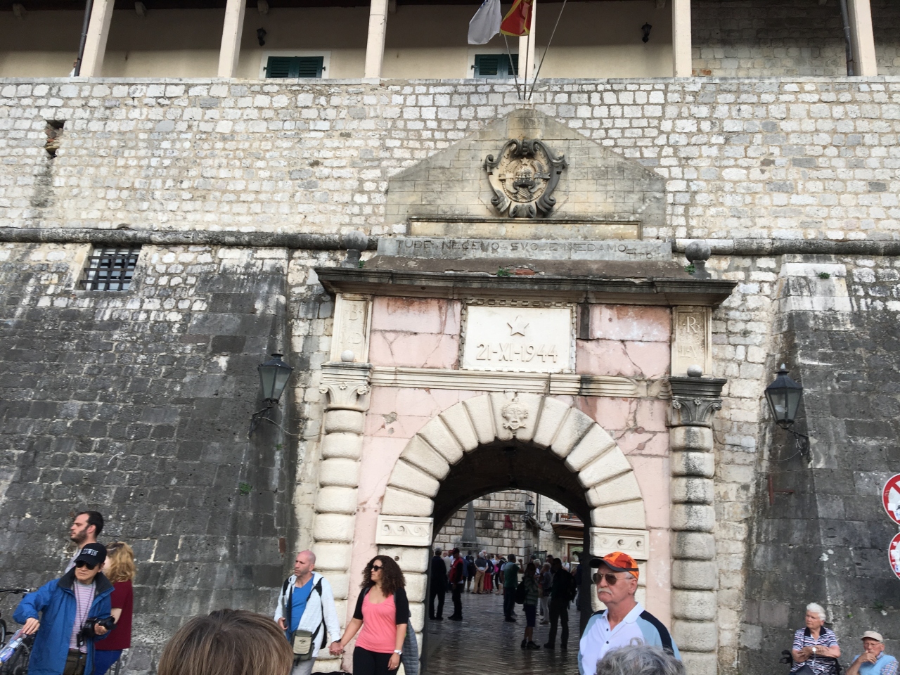 モンテネグロの城塞都市コトルには3箇所の門があって北門と南門と西門です。西門にあたる海の門が正門になります。コトル湾に面した門で、近くには観光案内者があるのでここで地図をもらって正門から