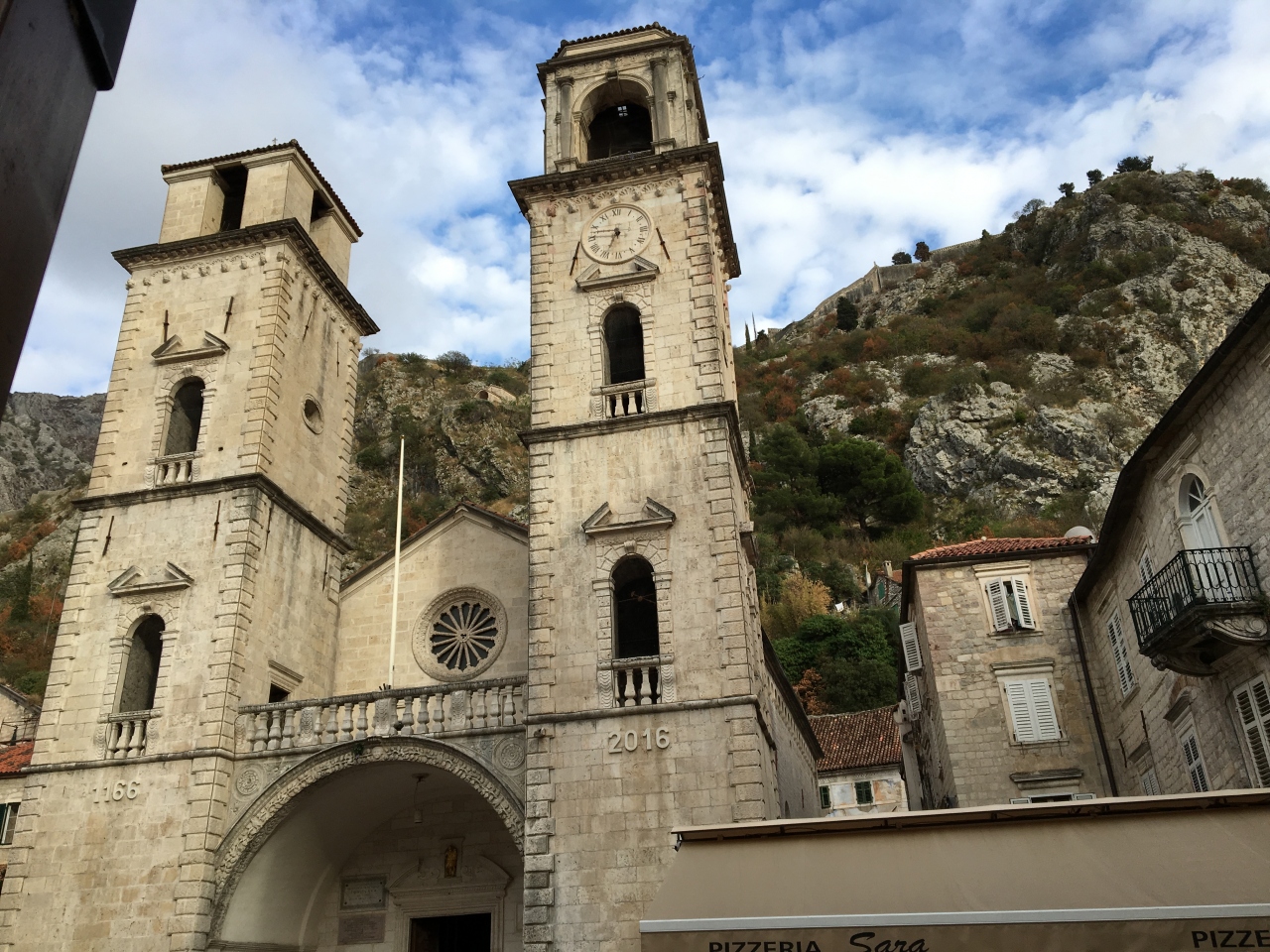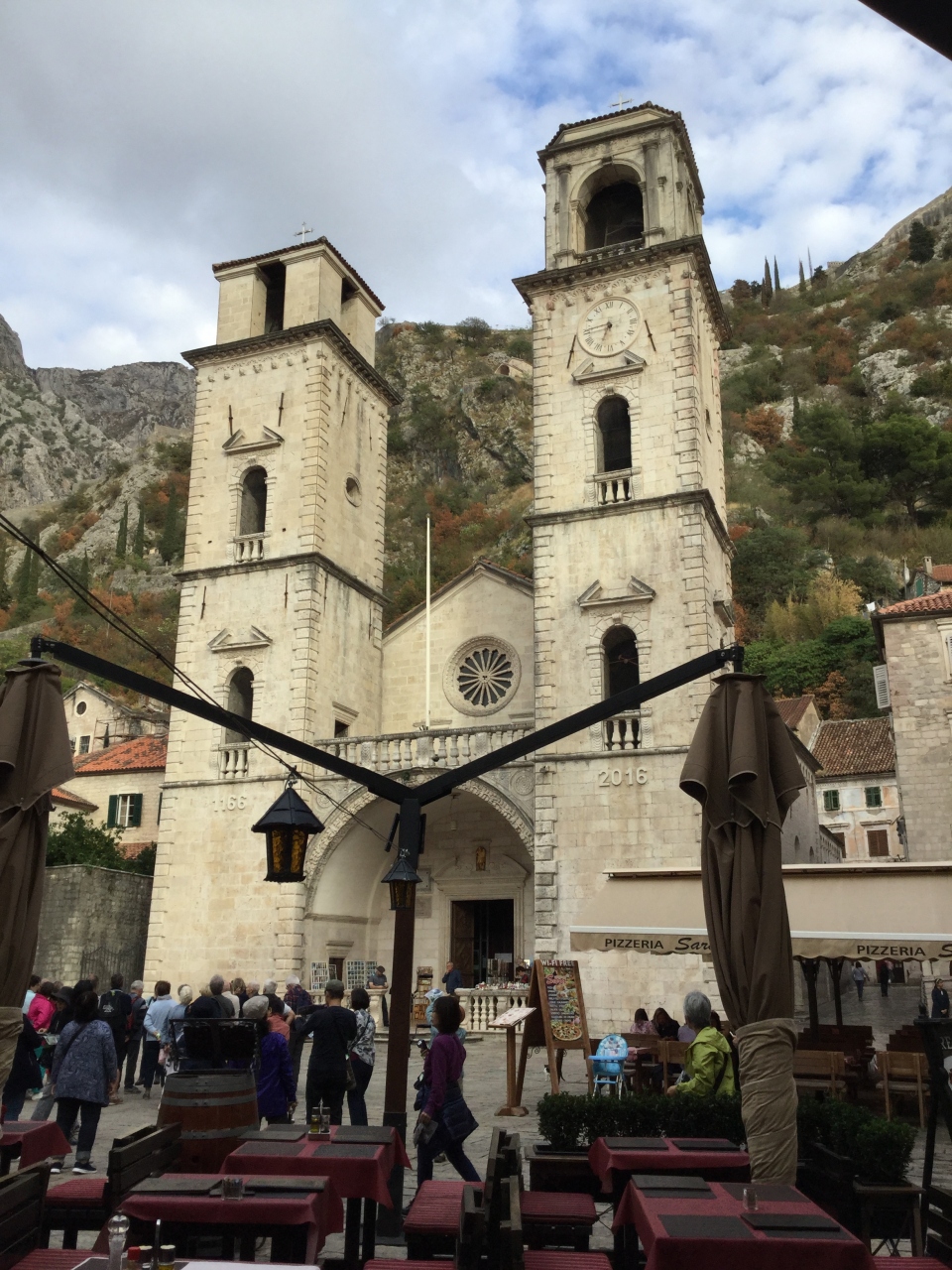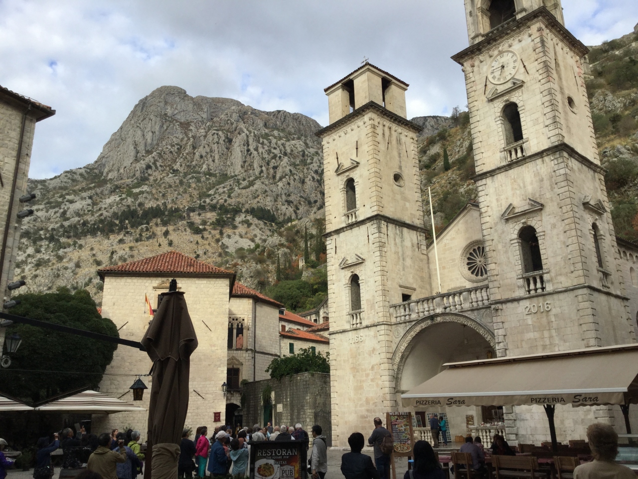 モンテネグロの要塞都市コトル旧市街に行ったら、この聖トリプン大聖堂は、まず、はずせない場所です。コトルのランドマークとして旧市街に迫るロブチュン山に造られた要塞をバックに堂々と聳え立つ姿は見事です。大聖堂のあるトリプン広場は、旧市街で一番広く賑わっています。