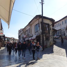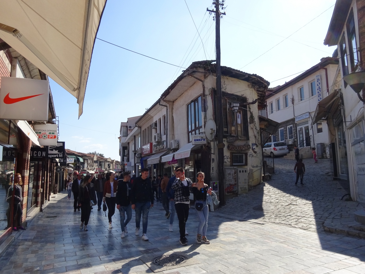 歩行者天国の商店街です。周りにお店がずらっと並んでいて、オフリド湖までの道をゆったり歩けます。一本向こう側に、車道もある広くてまっすぐな道が通ってますが、断然こちらを歩いたほうが面白いです。バルカン半島っぽい雰囲気のお店が並んでいて、観光に来た!という感じで盛り上がります。