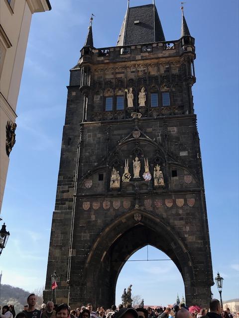 プラハの旧市街の方からプラハ城に向かって行くとこの旧市街橋塔が見えてきました。真っ黒な一種異様な姿とをしています。迫力があります。カレル通りも人混みが多かったですが、この旧市街橋塔の前は観光客でごった返していました。後で知りましたが、登れるようです。