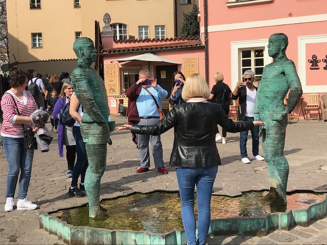 プラハ城から降りてきて。まずはジョンレノンの壁を見に行きました。その次にこのフランツ カフカ博物館に向かいました。カレル橋を挟んだ反対側になります。カレル橋の下に通路があったので、そこを渡って行きました。博物館の前に緑色の一部が動くユニークな像があり、観光客は皆これを撮影していました。確かに面白いです。