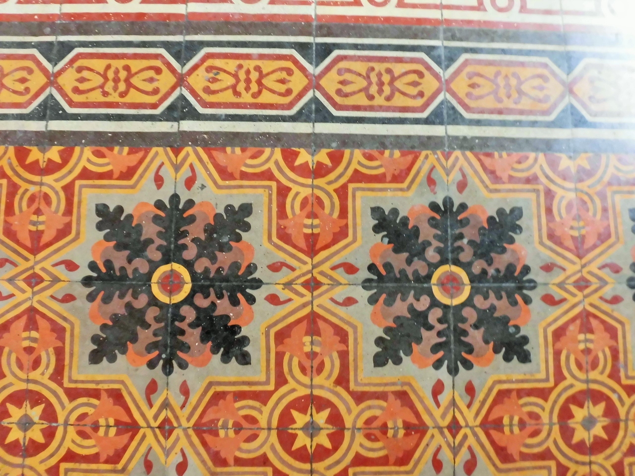 屋根の彫刻が外側も内側も素晴らしいです。また床のタイルも綺麗な模様です。