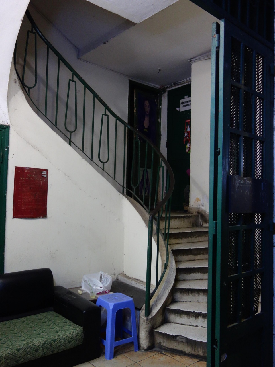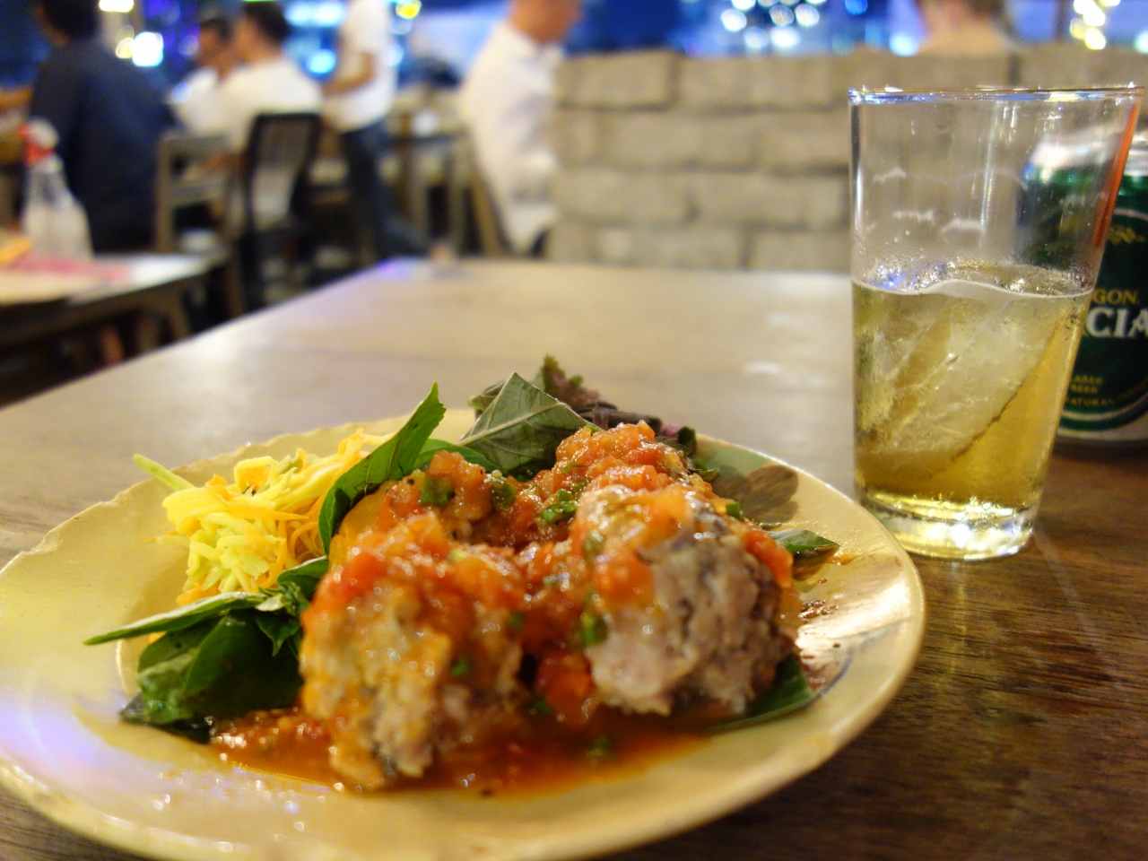 サイゴンセンターや高島屋からレロイ通りを挟んで向かい側ですが、地下鉄工事の囲いがあるためベンタイン市場から徒歩でレロイ通りに進みレロイ通り36番地を目指していったほうが分かりやすいと思います。36番地の路地を奥に進み看板のある入口を入り5階まで登ります。店内は落ち着いたカジュアルな雰囲気で、接客も丁寧です。夜景がきれいですが、テラス席希望の場合は予約しないとたいてい座れません。この日はトマトの肉詰めトマトソース65,000ドン(325円)とビール35,000ドン(175円)を注文し税金込みで110,000ドン(550円)でした。この味とサービスでこの料金は安すぎます。