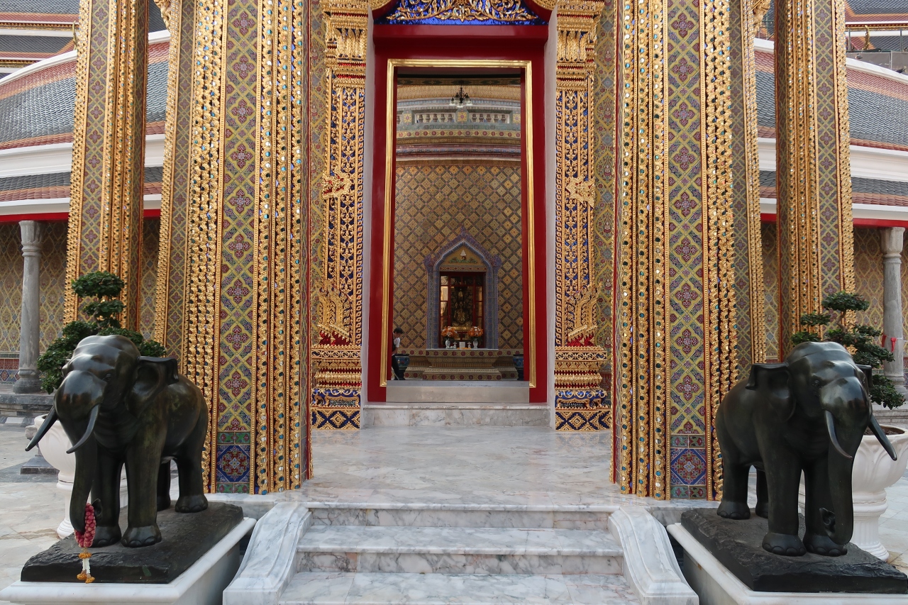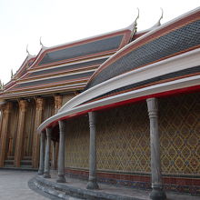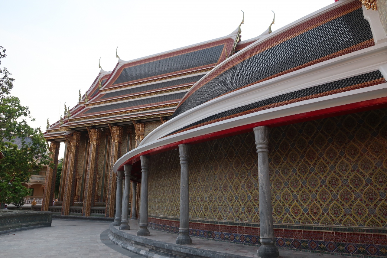 タイで特に敬愛されているラーマ5世によって建立されたお寺です。壁は美しいタイルで彩られていて、優美でした。本堂は法要中で入らなかったのですが、東欧の教会のように内部に仕切りがあり、ピンクをベースとした西洋の影響を感じさせる内装になっているようでした。