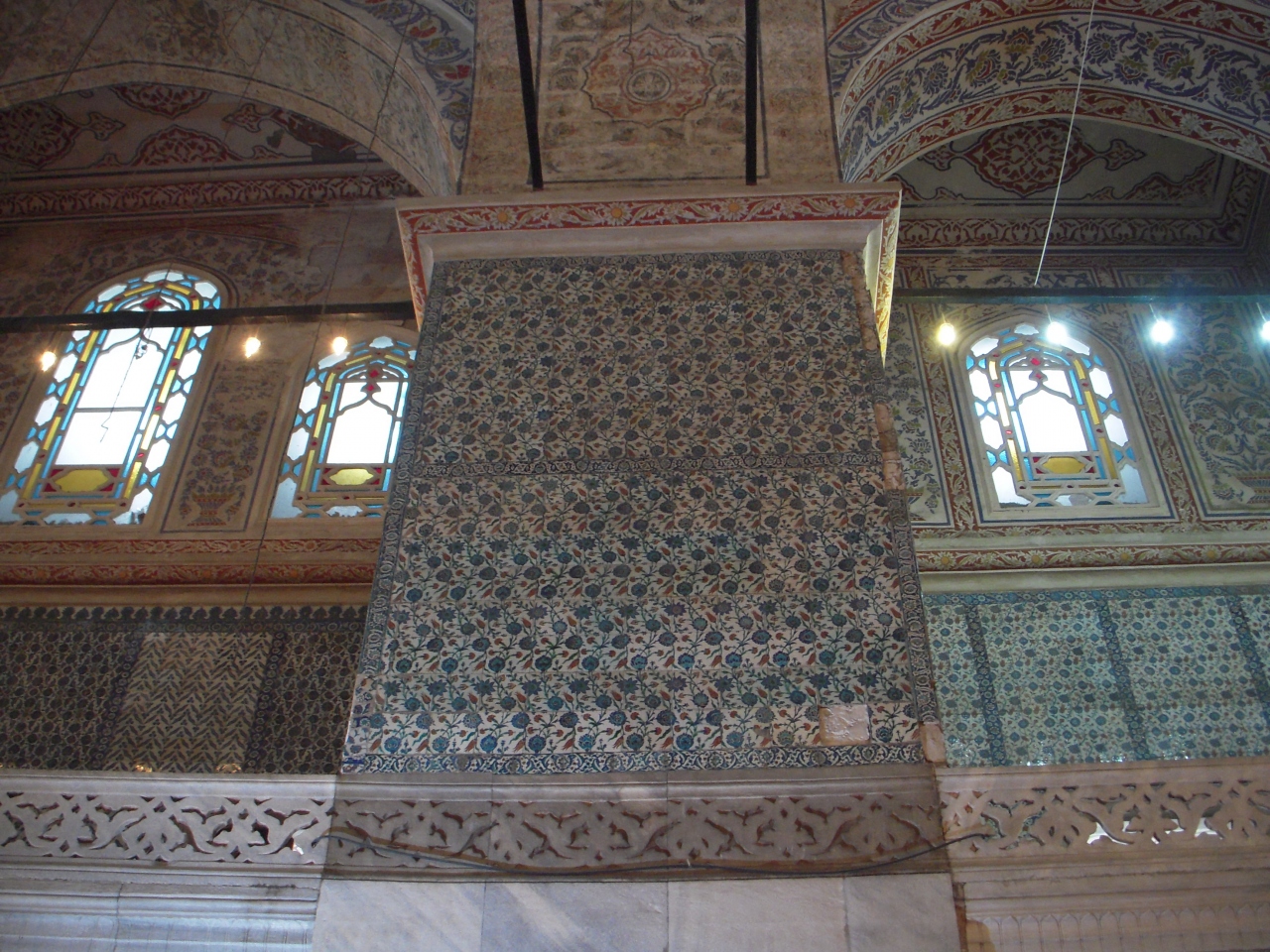 大ドーム内部の礼拝所内の精緻なタイル装飾が美しく、天気の良い日は彩色であふれています。